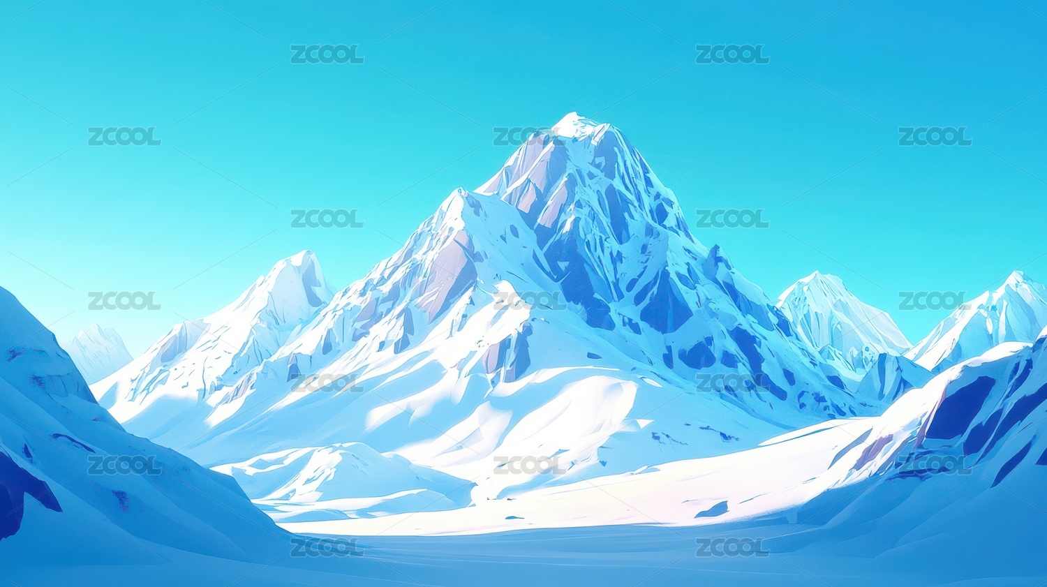 白天晴朗白雪覆盖的巍峨山峰雪山3D插画