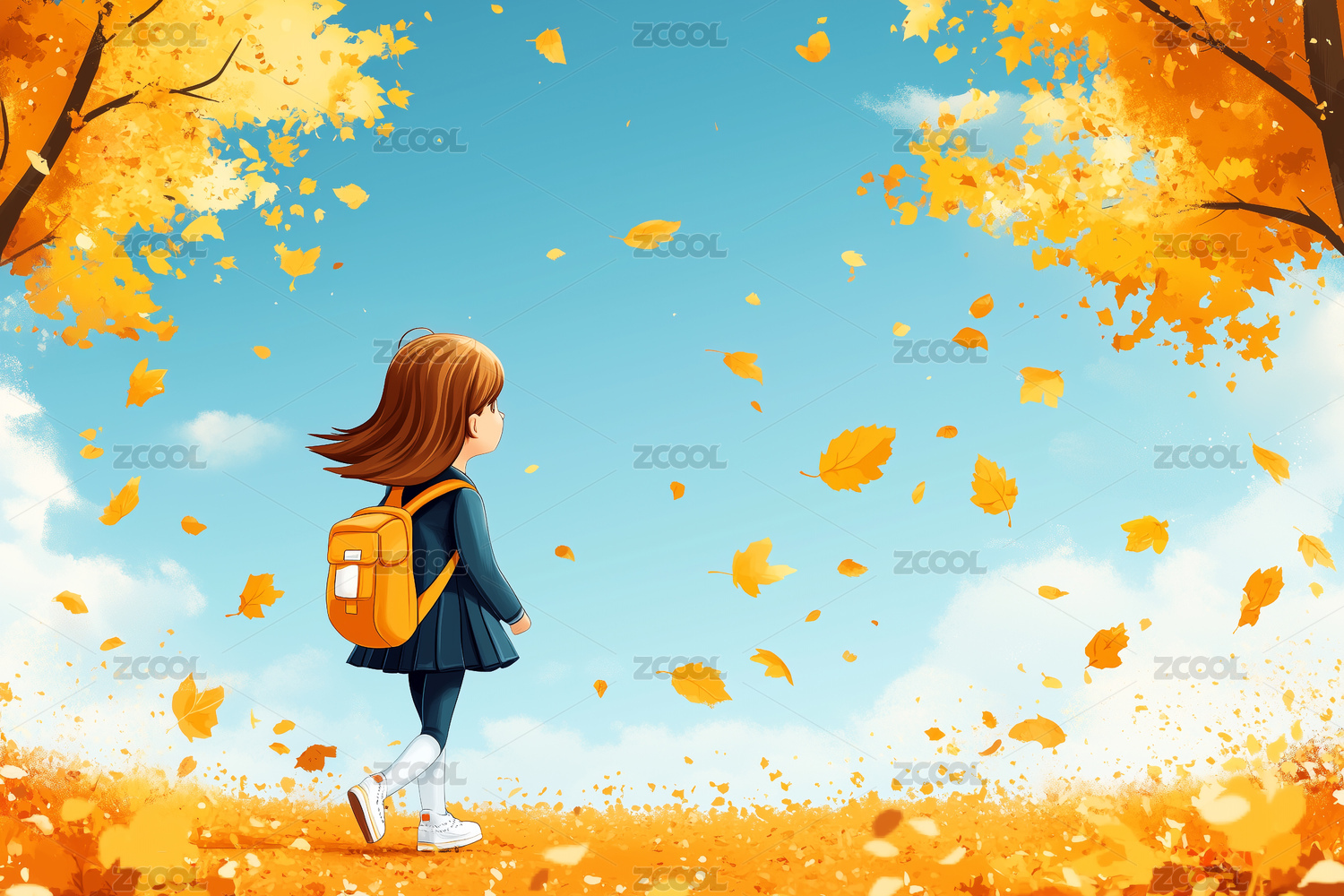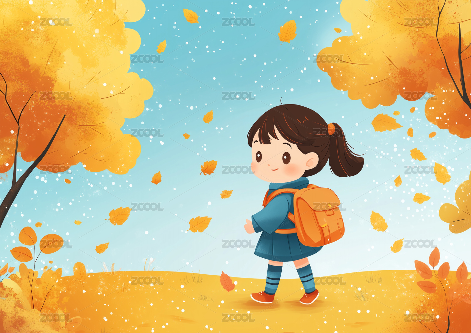 书包,男孩,学生,秋天,季节,插画,儿童,绘画,卡通,落叶