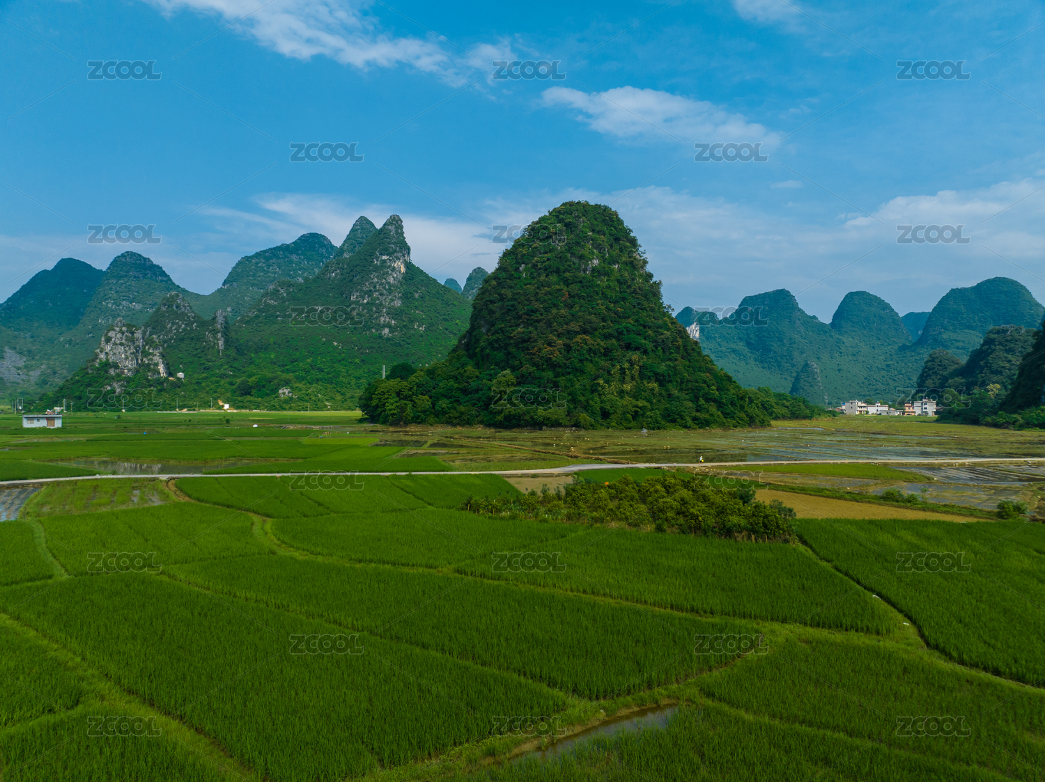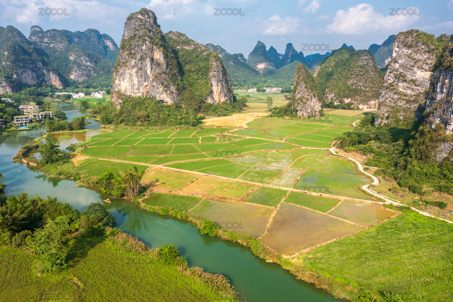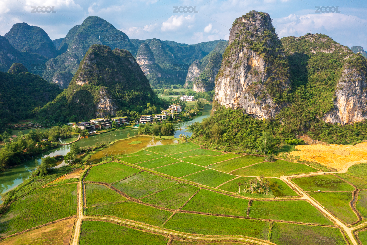 蓝天白云阳光下桂林山间的村庄和绿色稻田