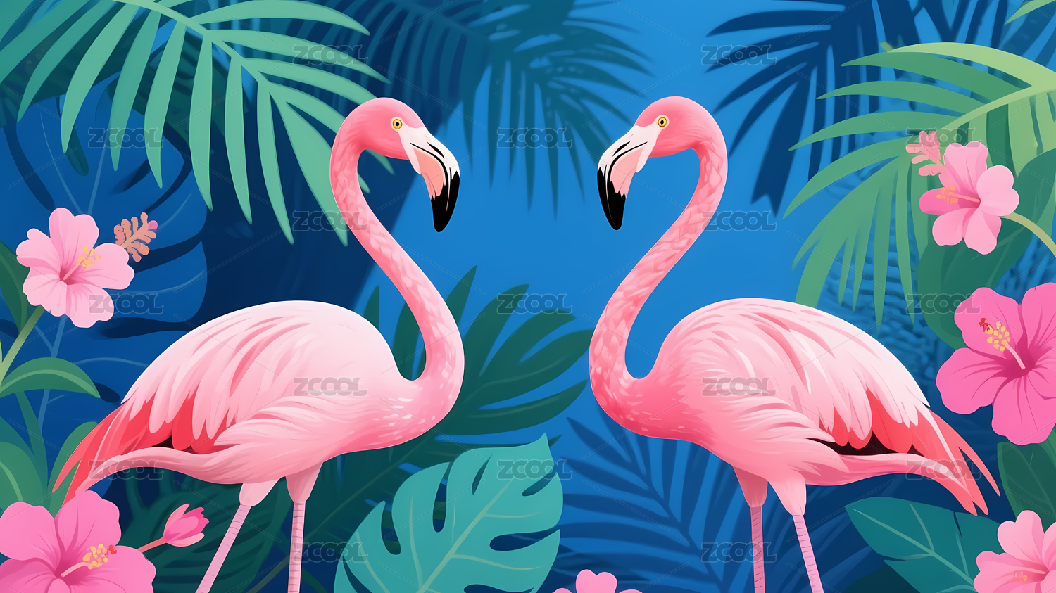 粉红火烈鸟与热带植物插画