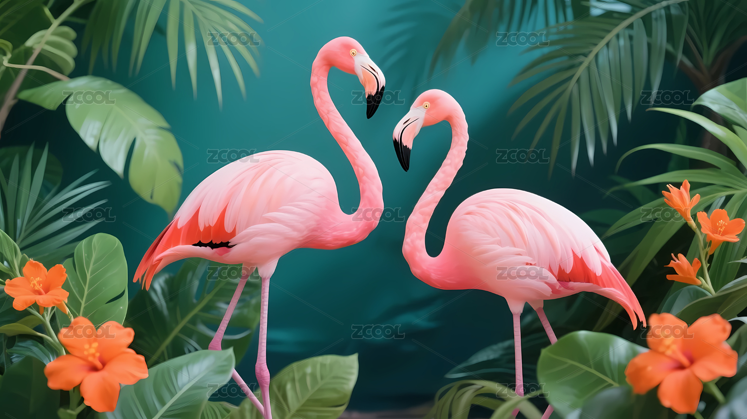 热带风情:火烈鸟与花卉