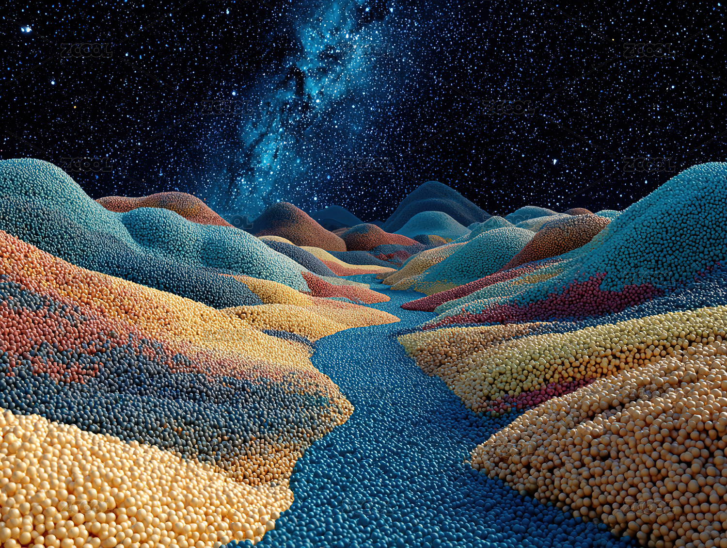 星夜下的彩色珠粒山谷