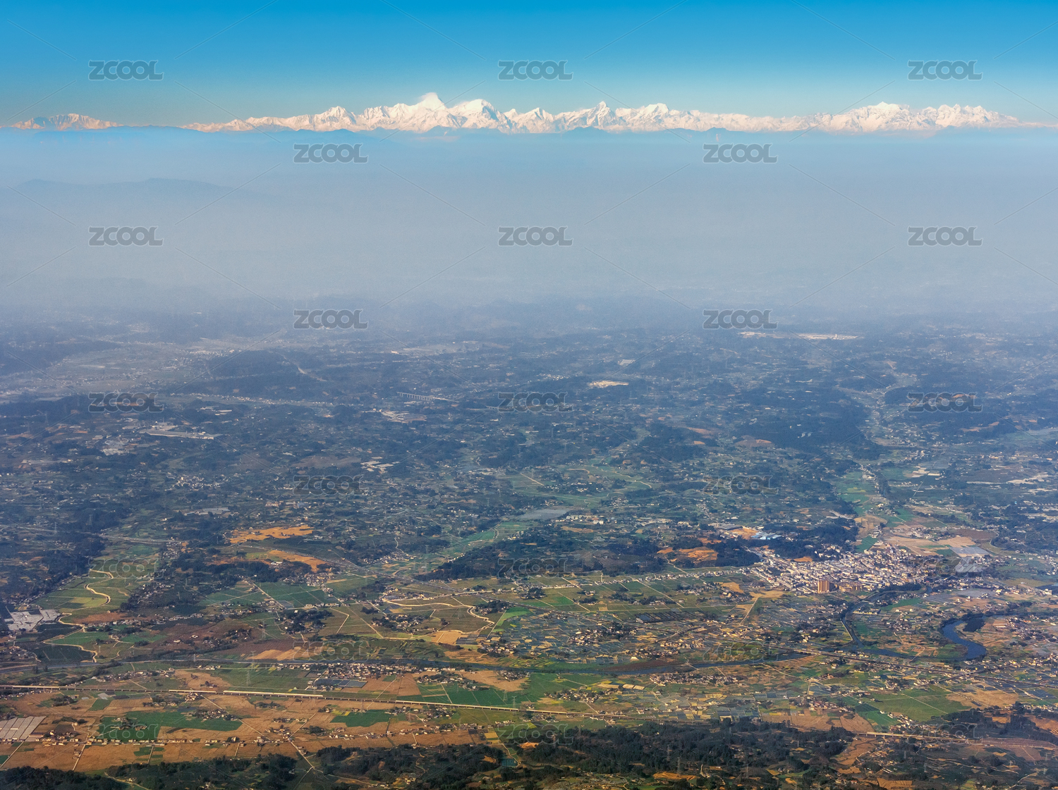 飞机上窗外的白色云朵、群山和乡村的白天风光