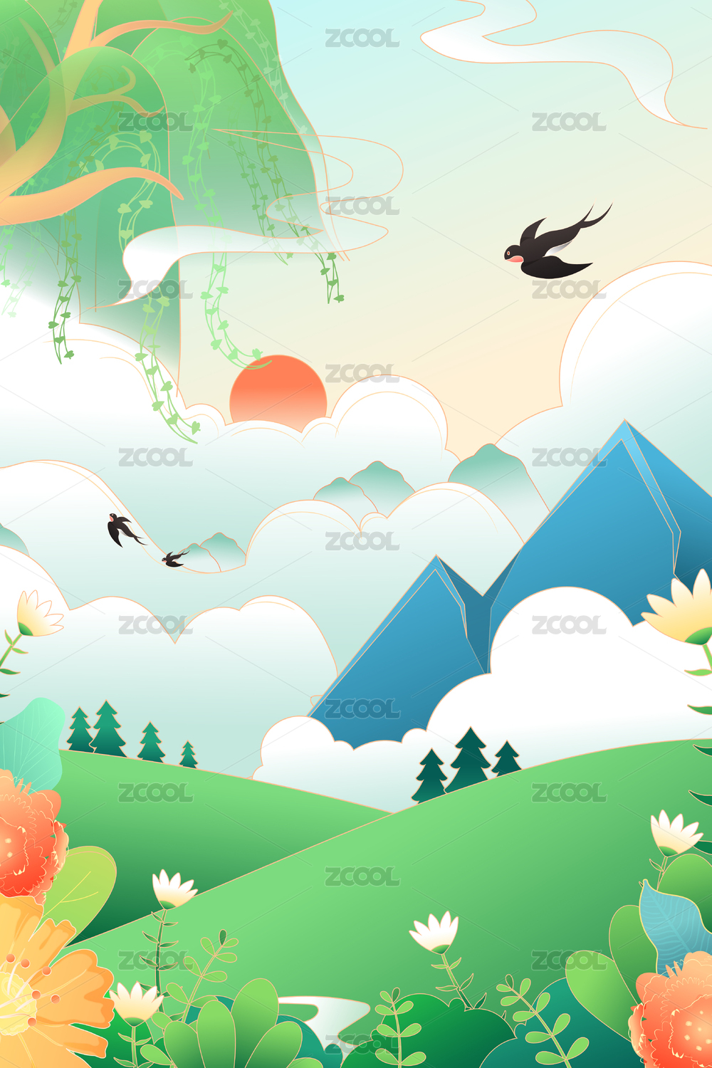春分节气燕子飞翔春天户外风景踏青国潮插画
