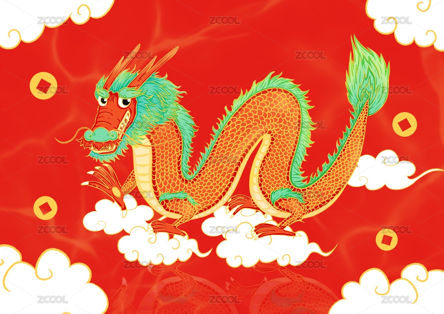 龙,龙年,龙纹,2024,插画,新年,庆典,金币,红色,金色