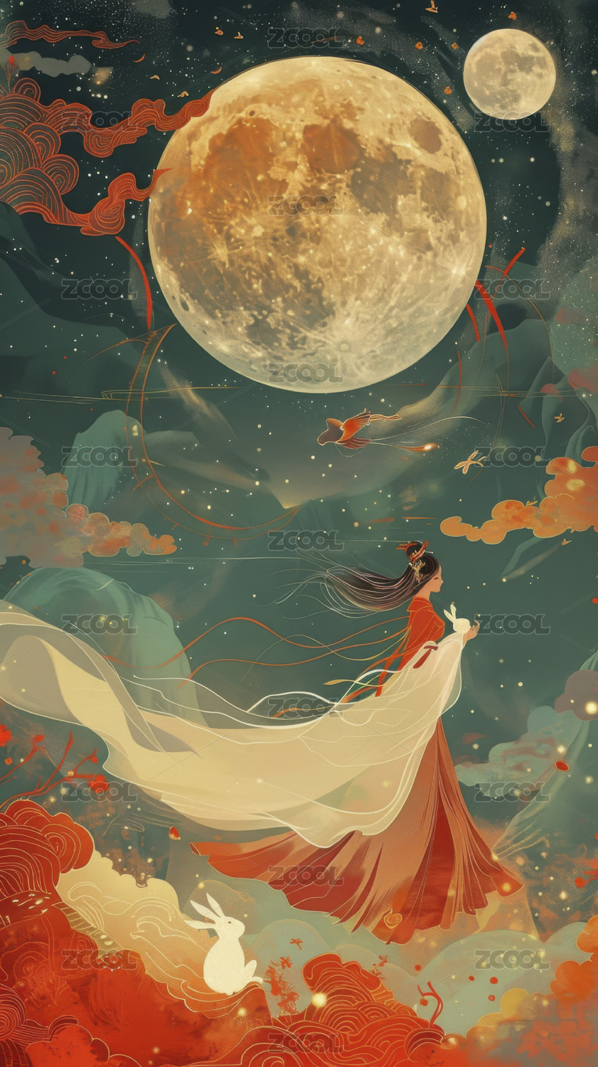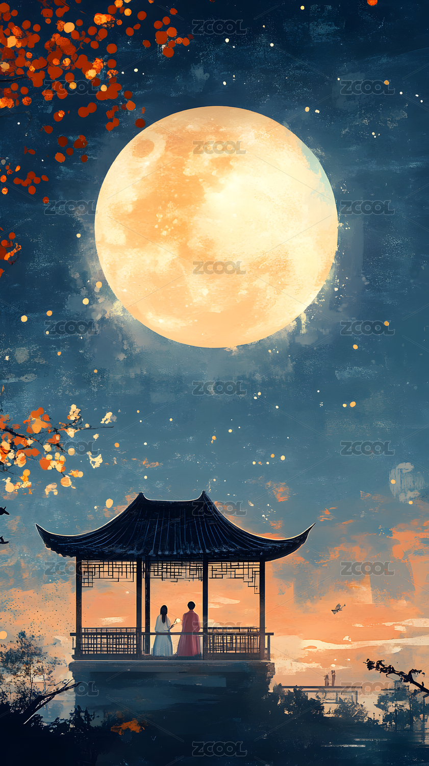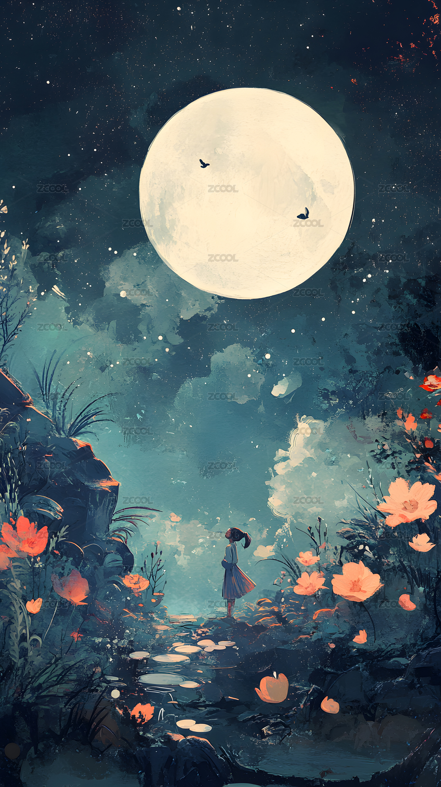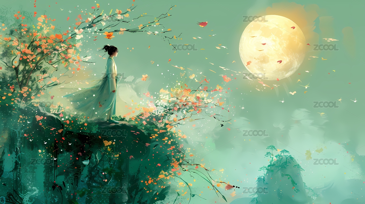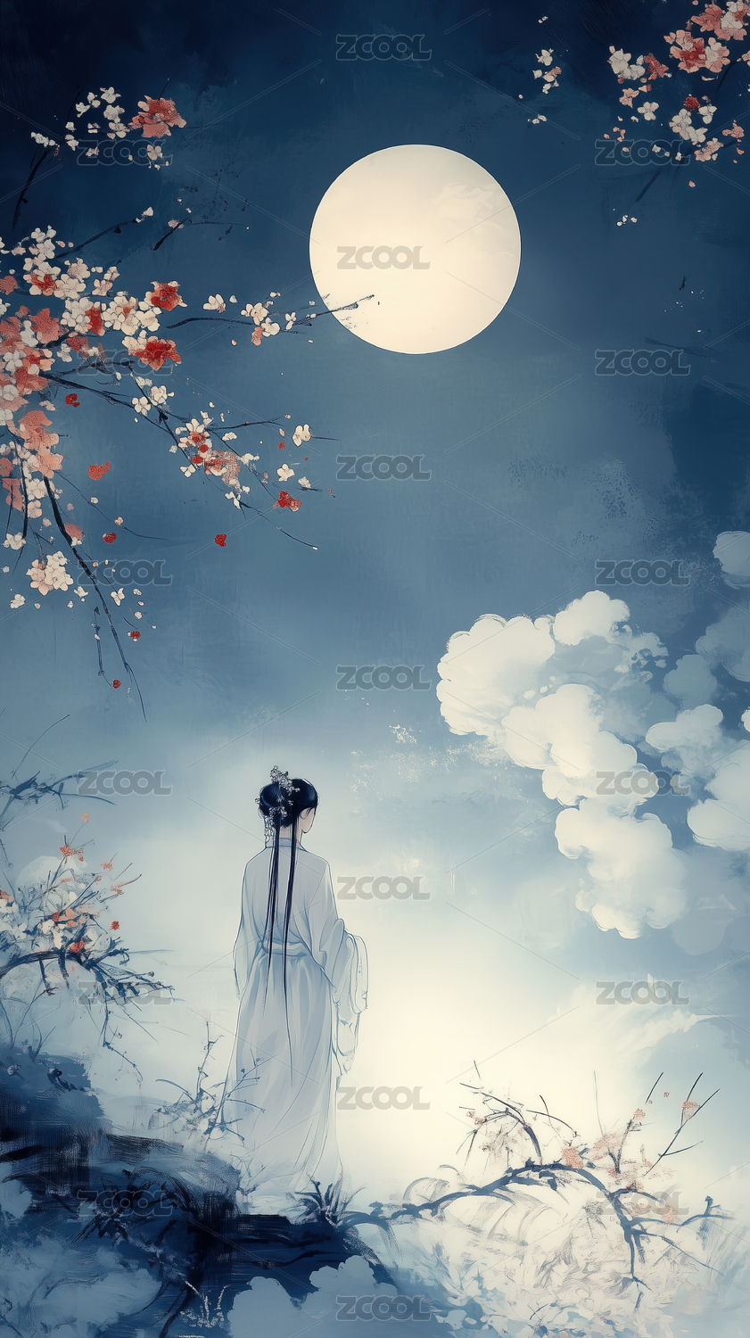 天空,艺术,女孩,节日,中秋节,赏月,月亮,满月,圆月,AIGC202403