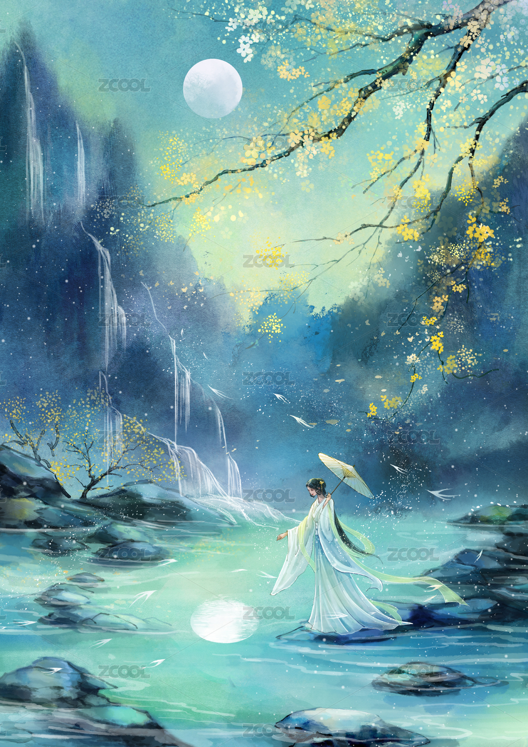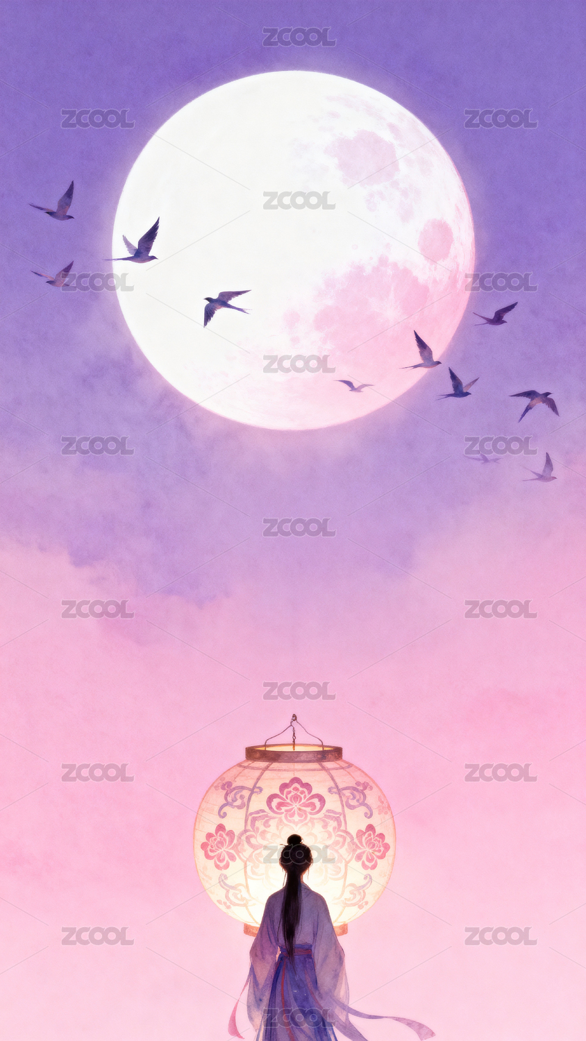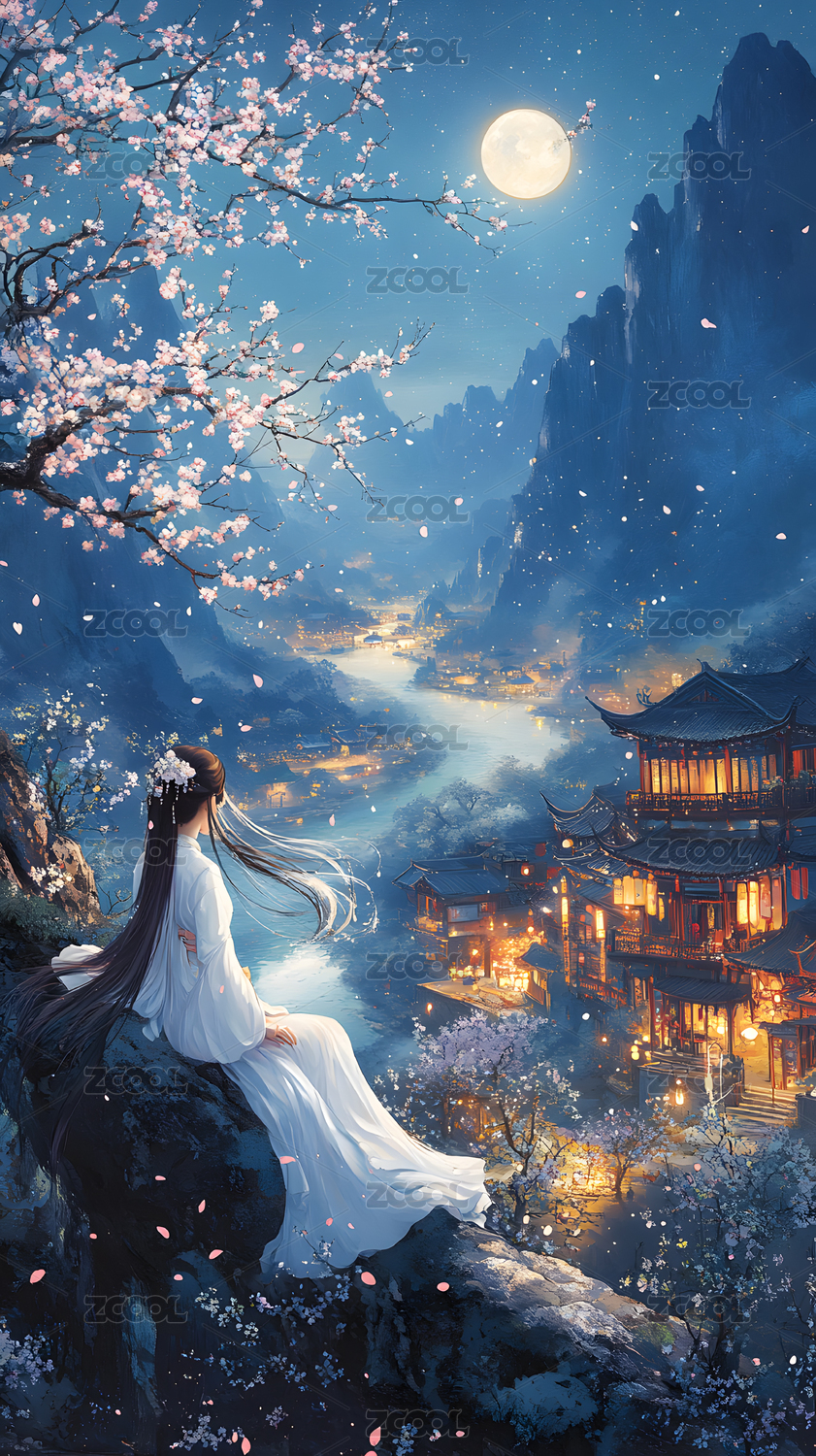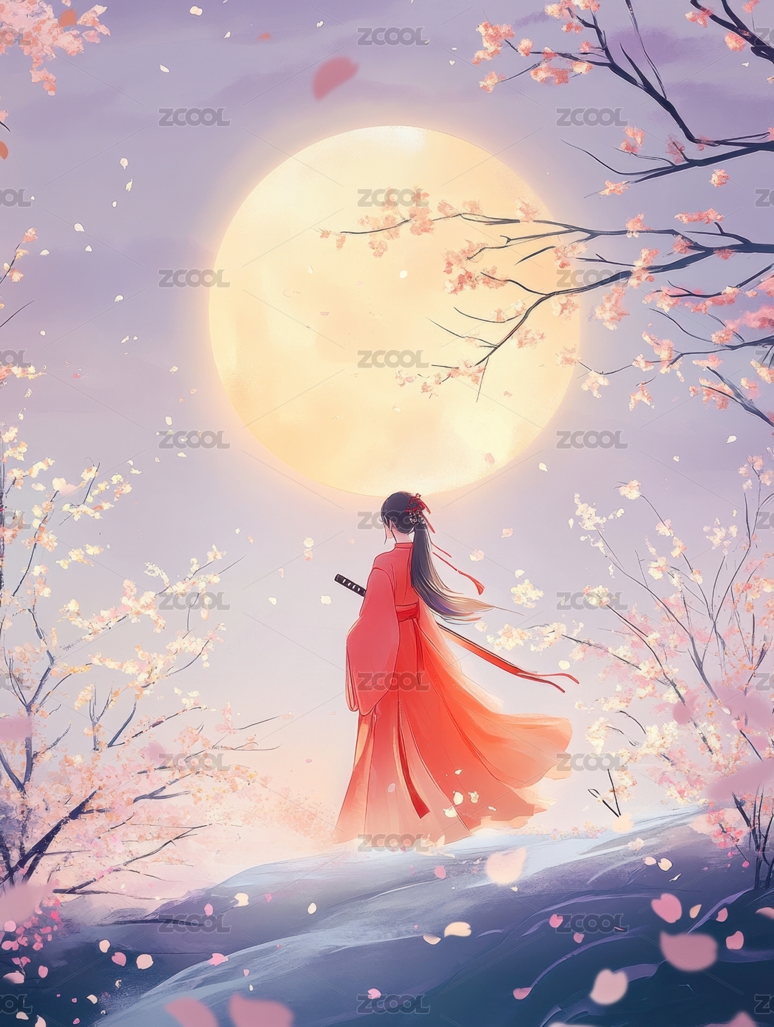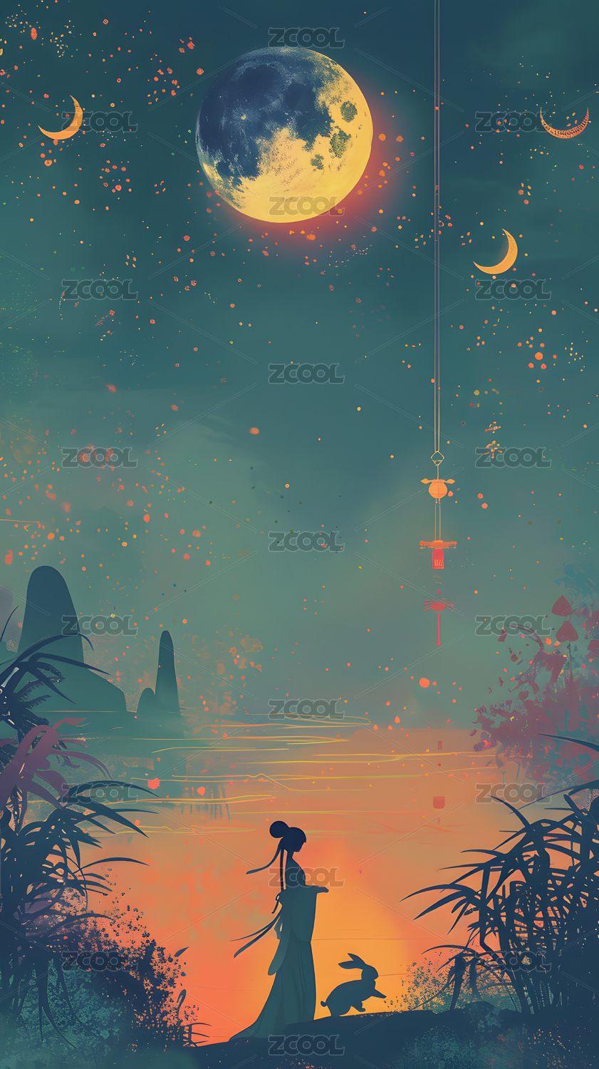 天空,艺术,女孩,节日,中秋节,赏月,月亮,满月,圆月,AIGC202403