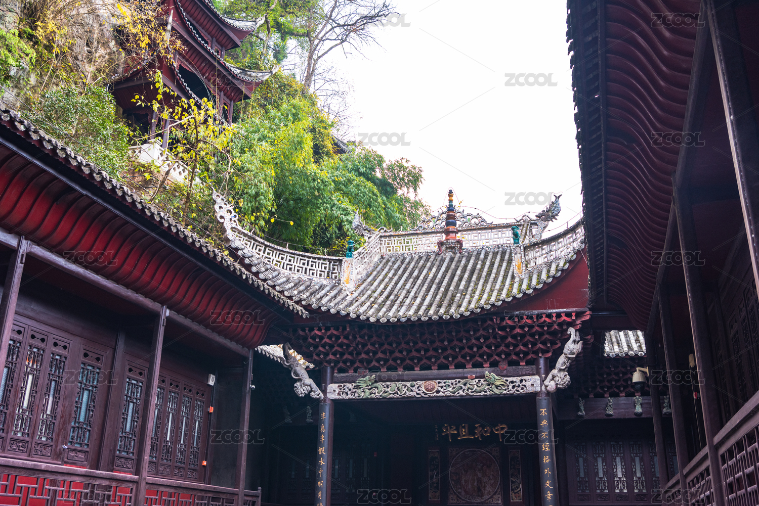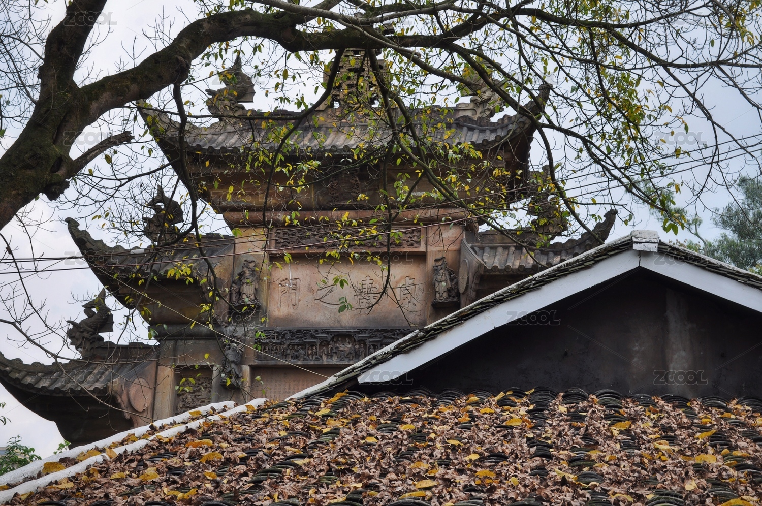 四川雅安蒙顶山天盖寺飞檐及春天梨花