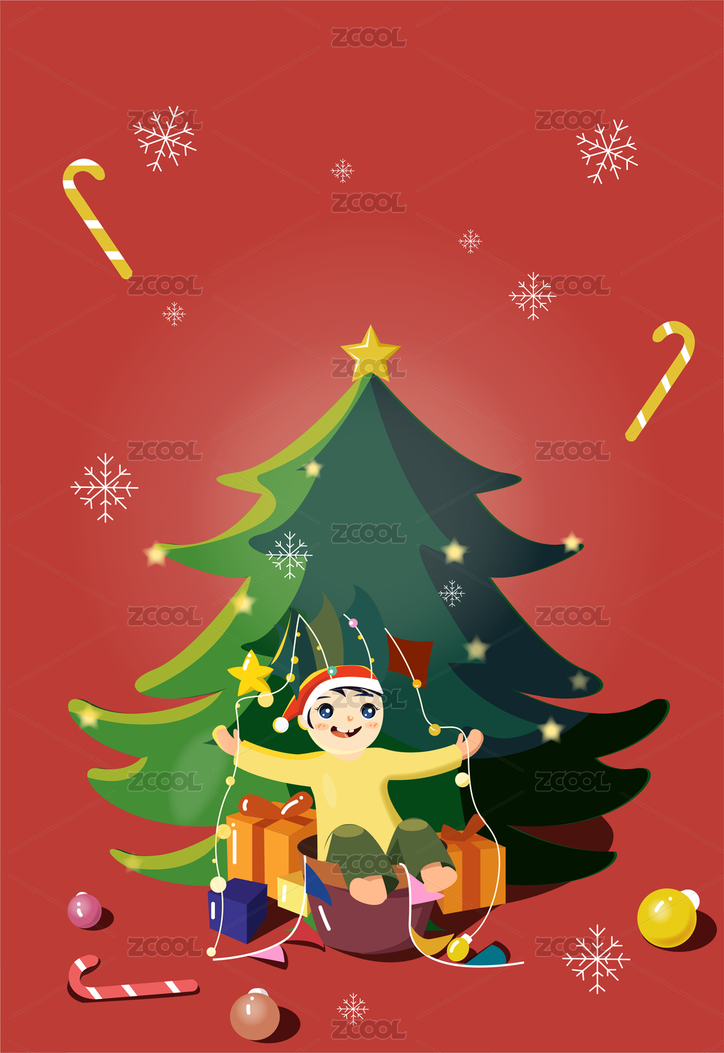 红色背景的圣诞树和礼物前装饰屋子的孩子