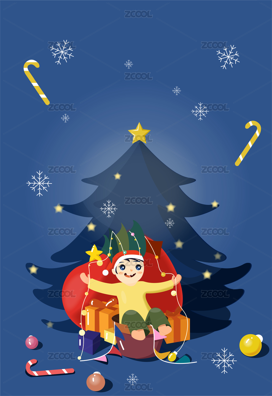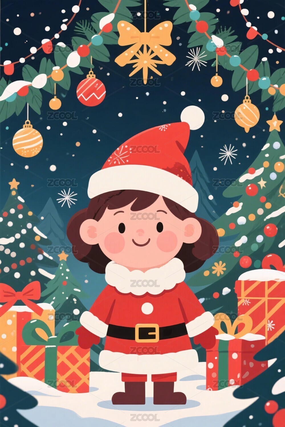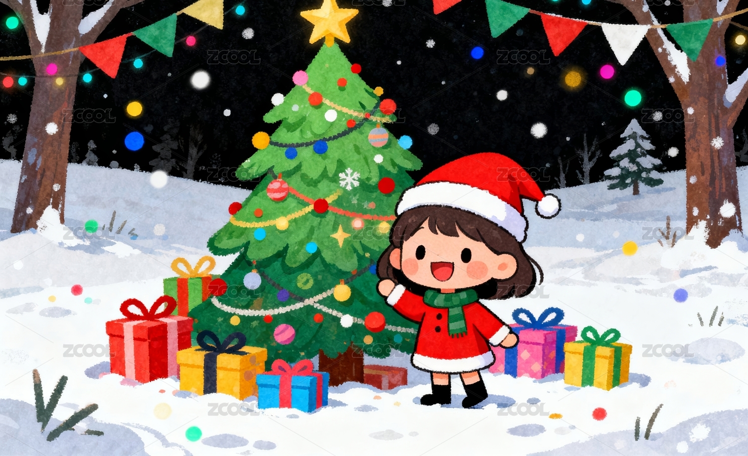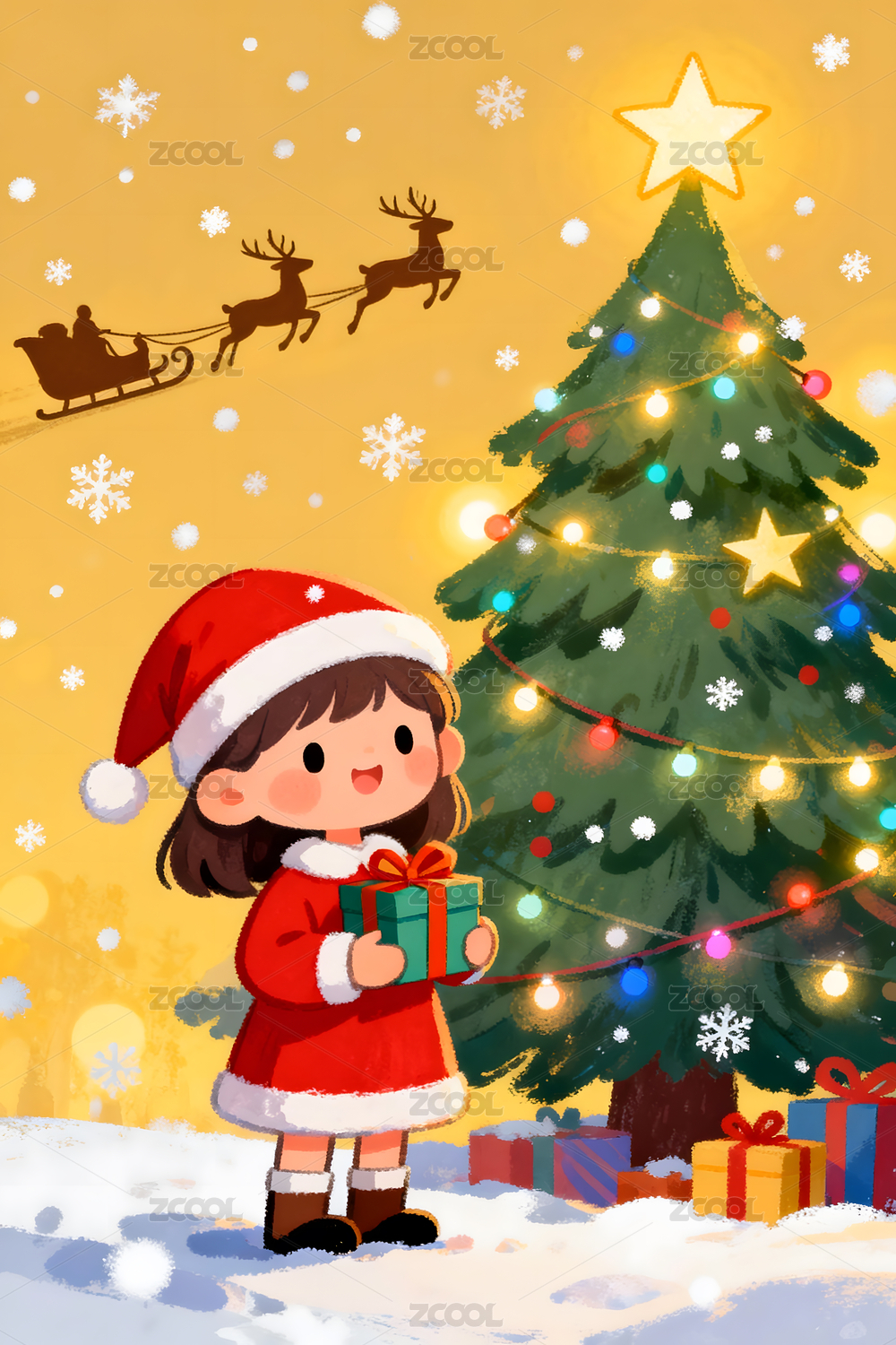圣诞节,圣诞树,圣诞老人,小女孩,夜晚,雪地,雪景,礼物,圣诞