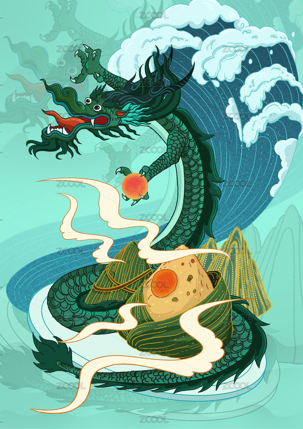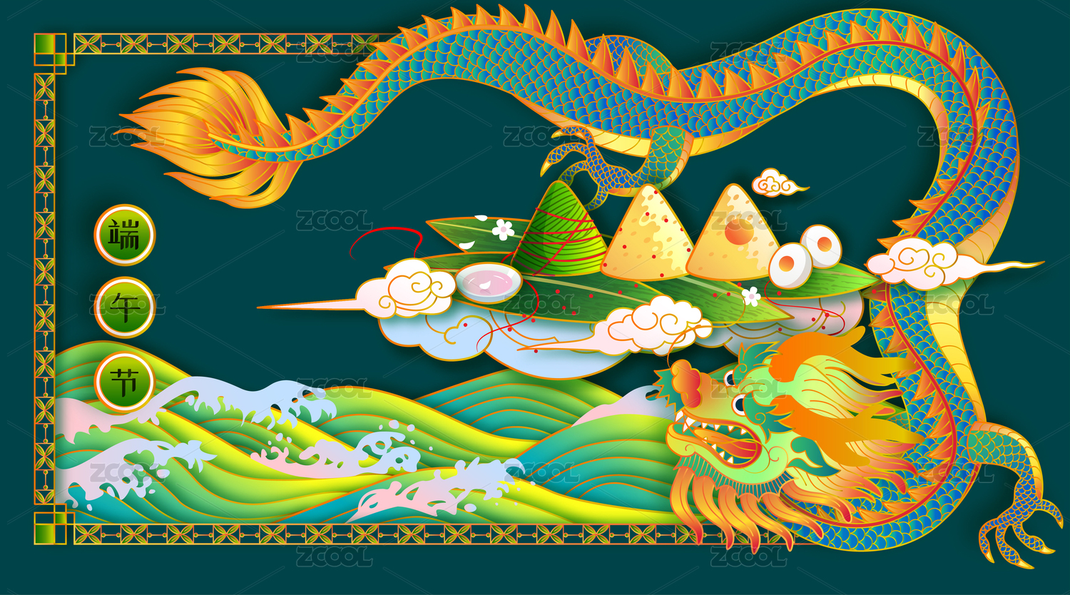 国潮端午节青龙绿水翔云围绕着粽子横版