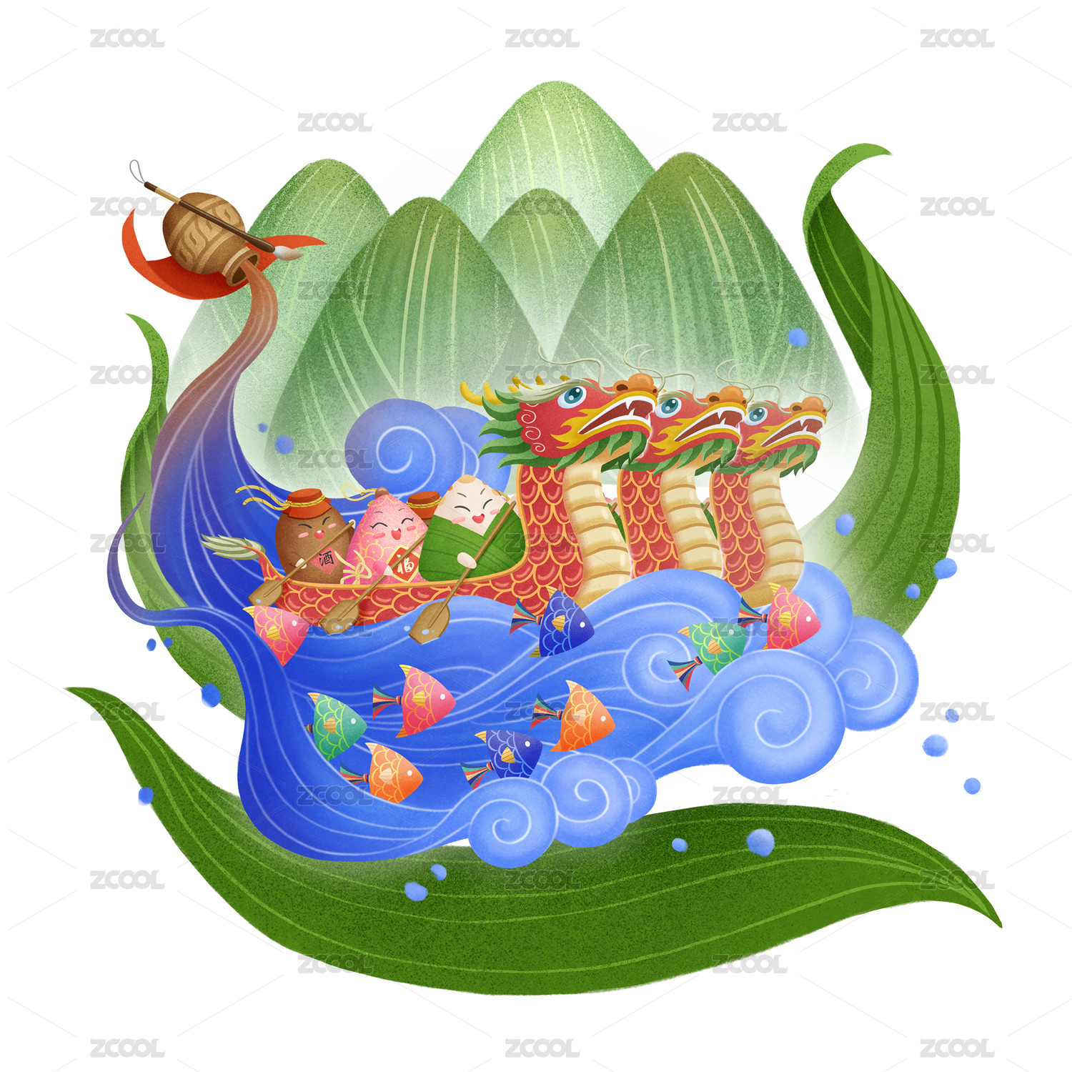 端午节神龙滑龙舟粽子江河国潮插画设计