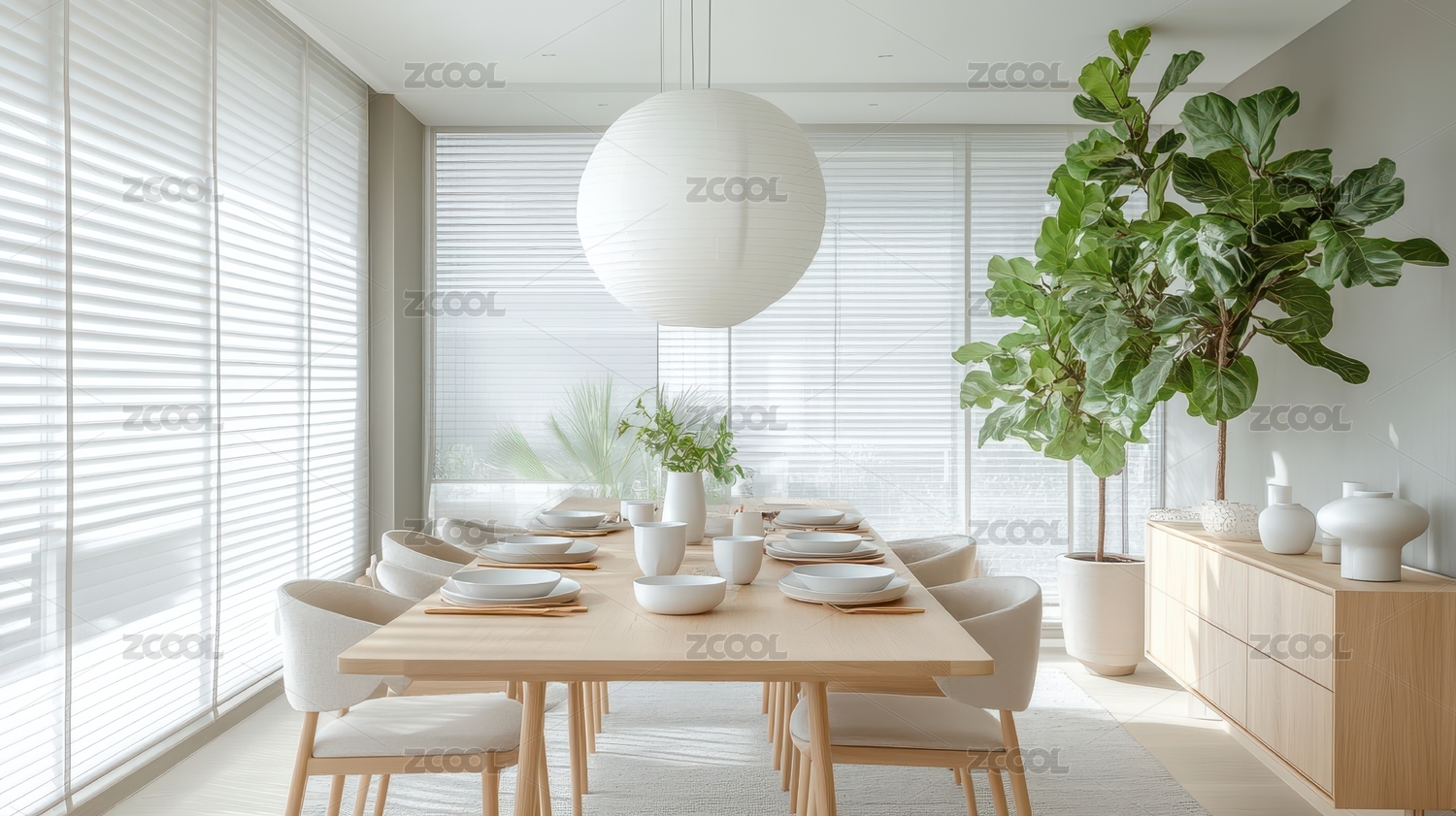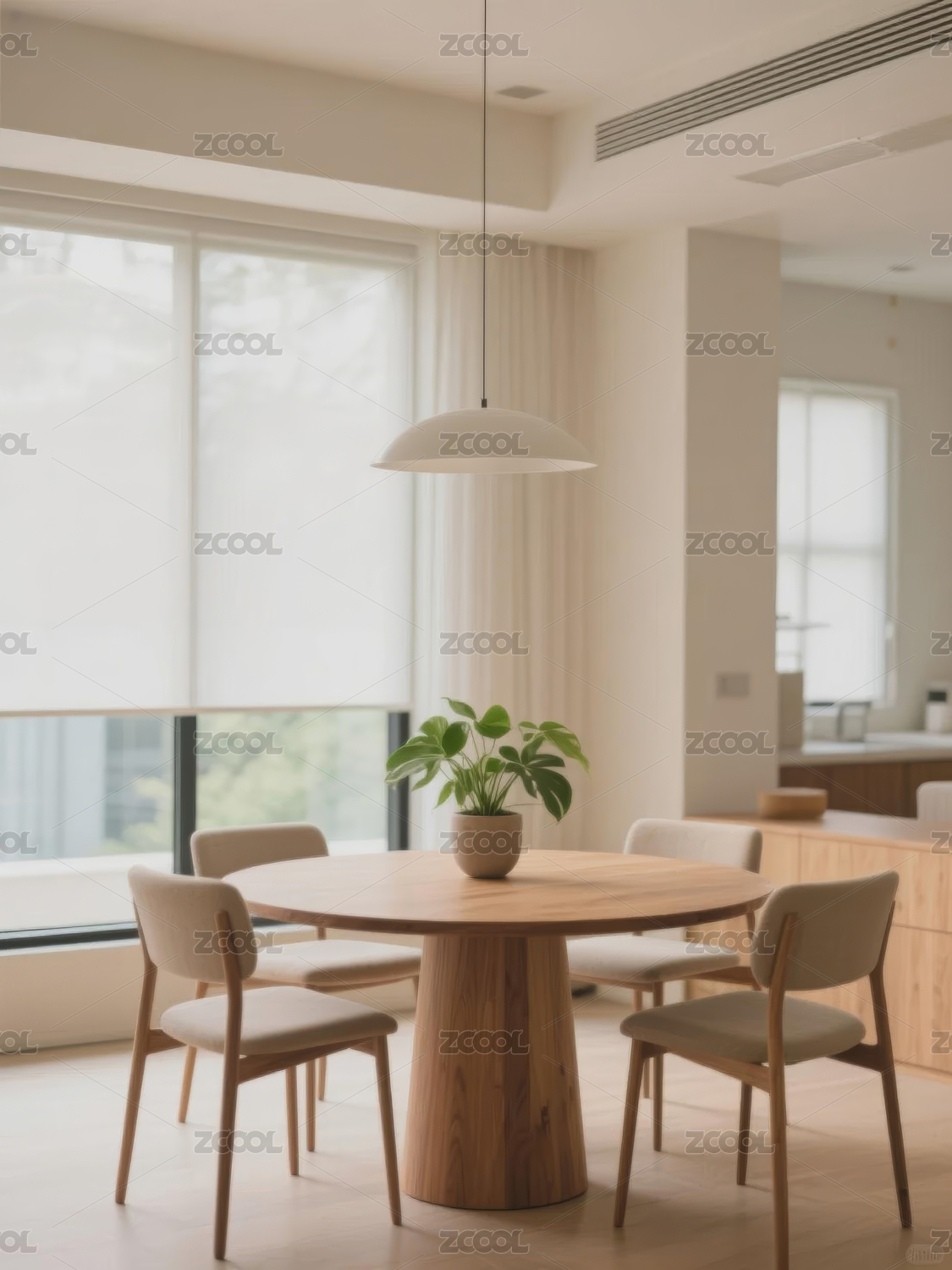 现代简约风格餐厅木质餐桌椅与自然光线相得益彰