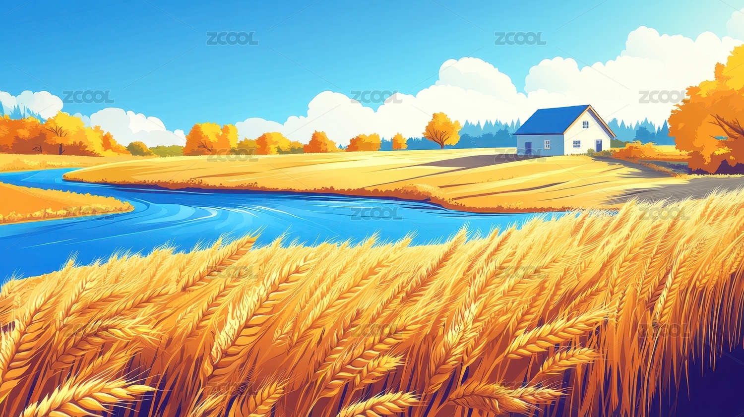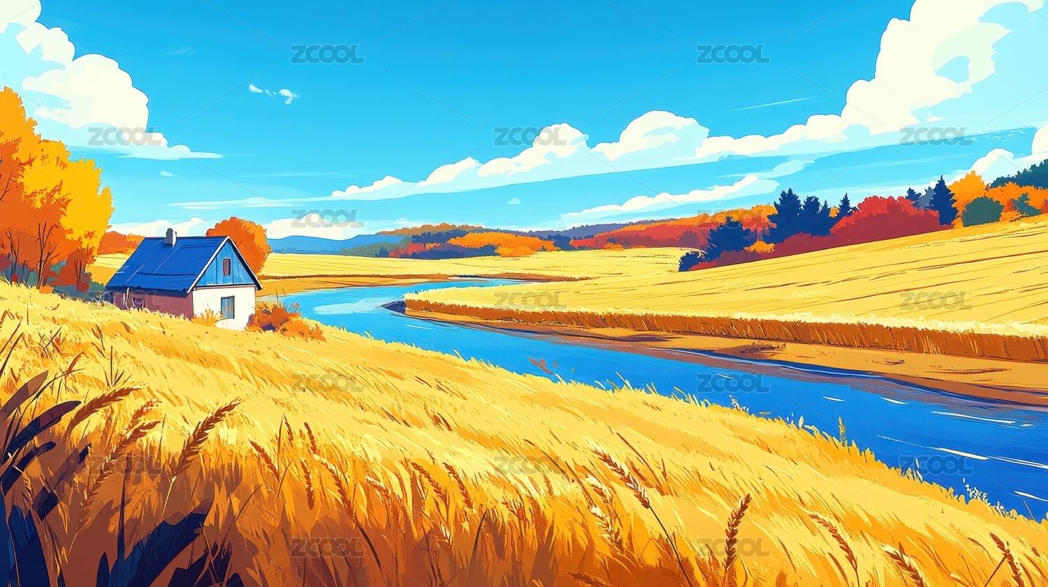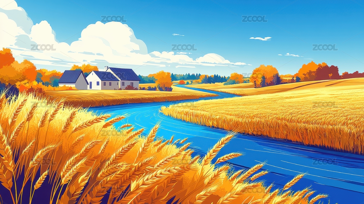 金色田野蜿蜒河流与蓝色屋顶农舍