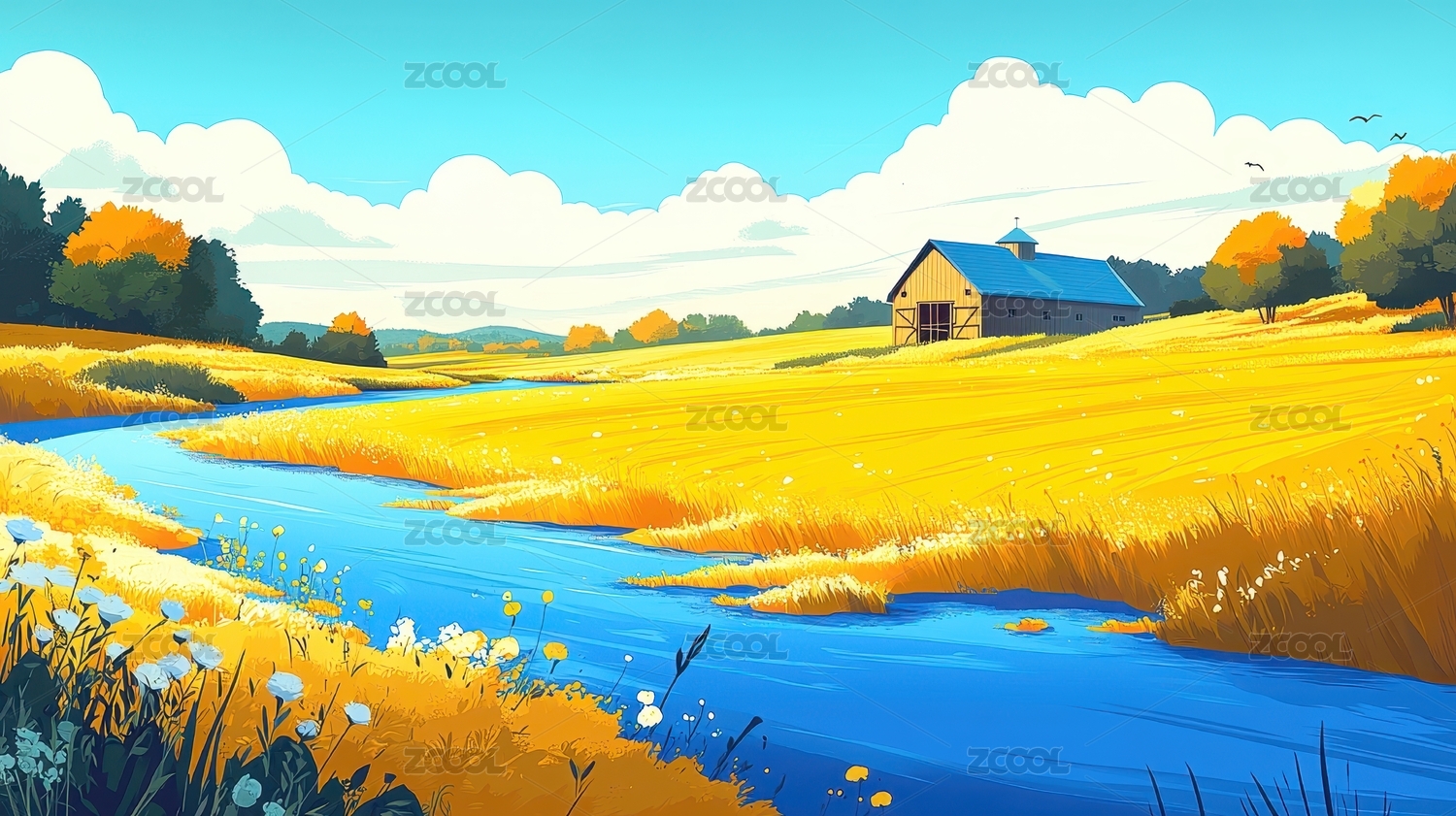 秋日田园金色河流