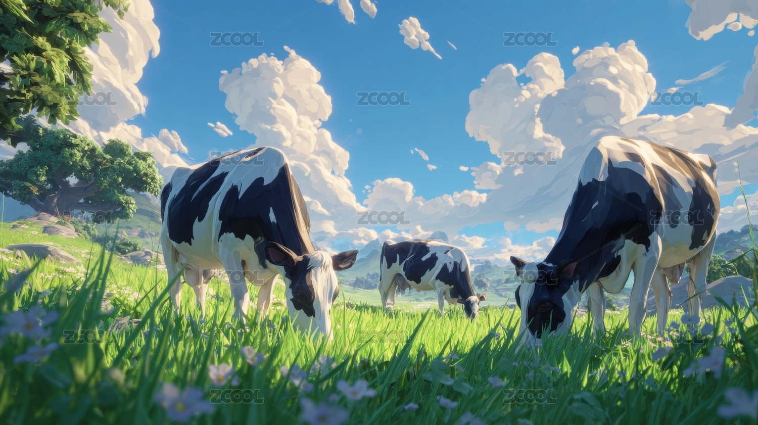 春天,奶牛,草原,草地,大场景,自然,天空,云,花卉,空气清新