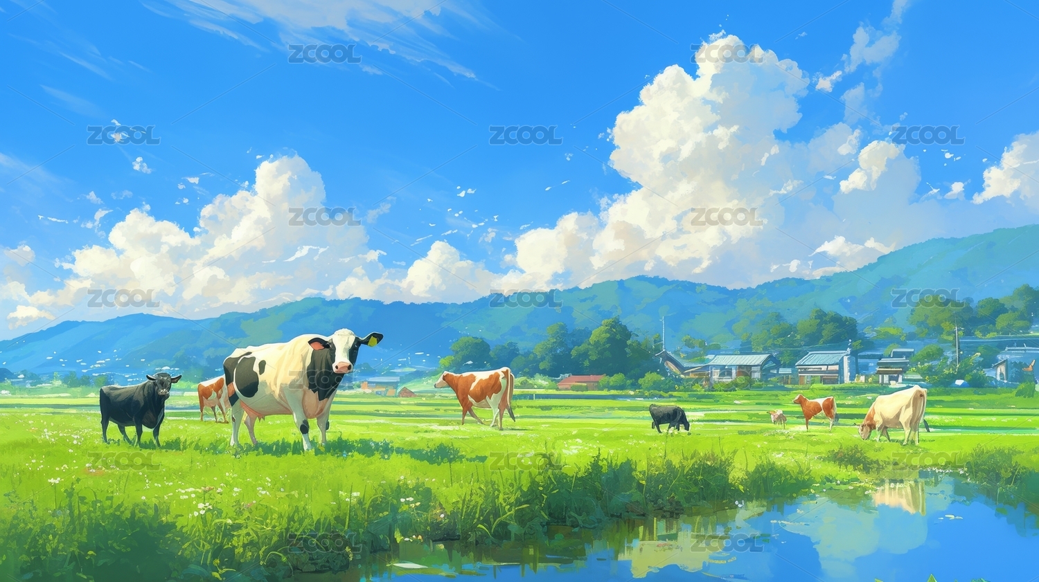 春天奶牛在草原吃草环境优美蓝天白云阳光
