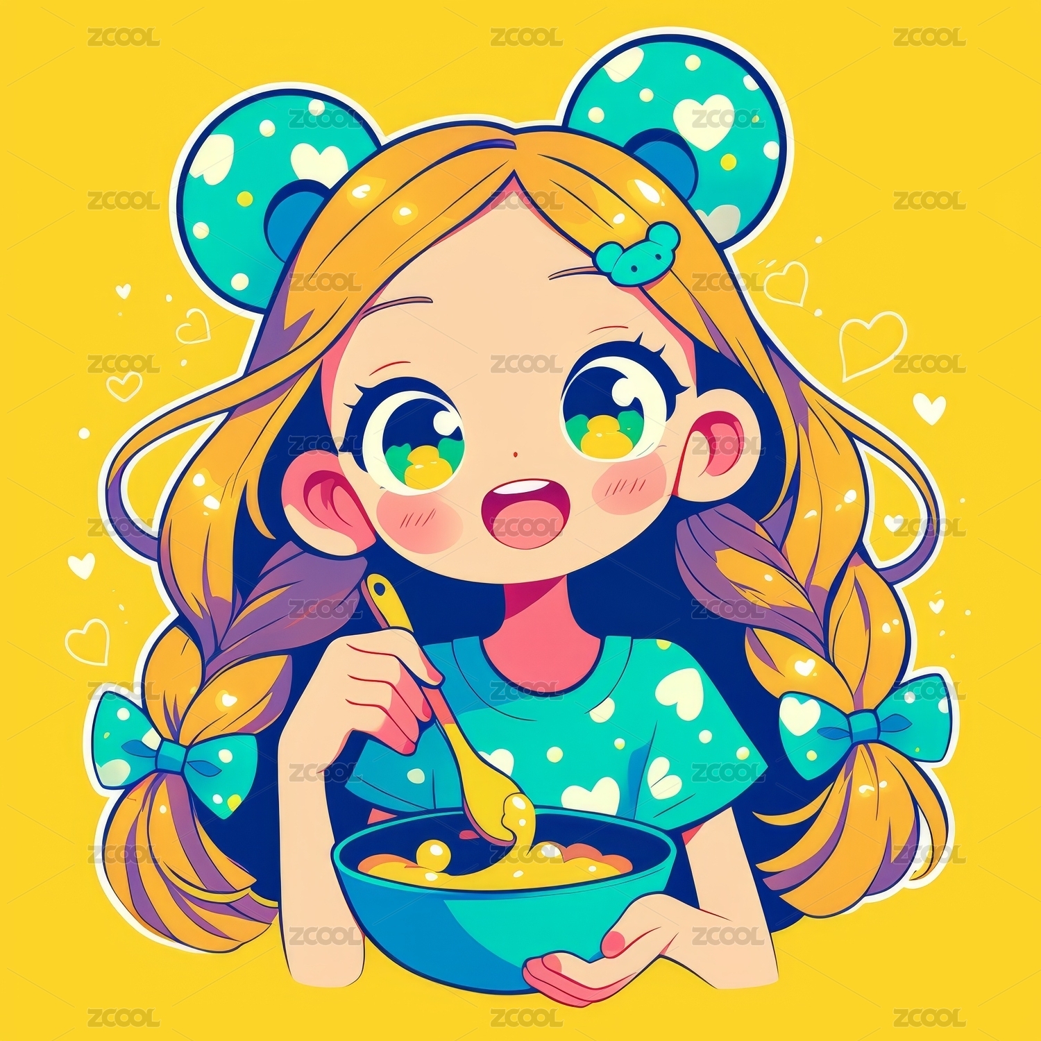 卡通高饱和度麻花辫女孩拿着碗