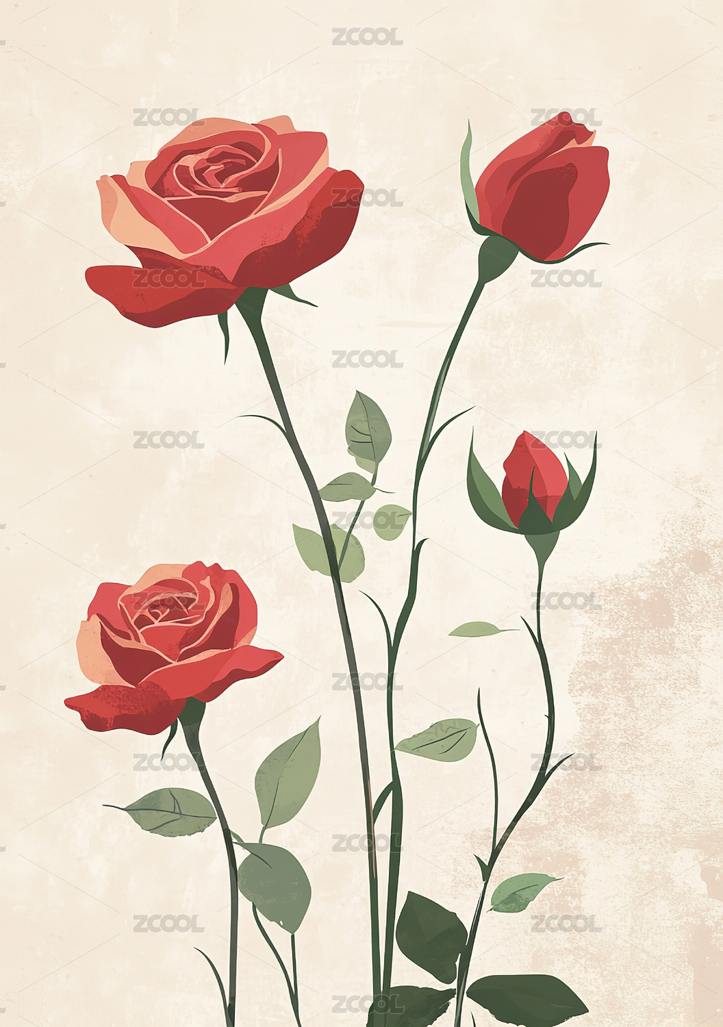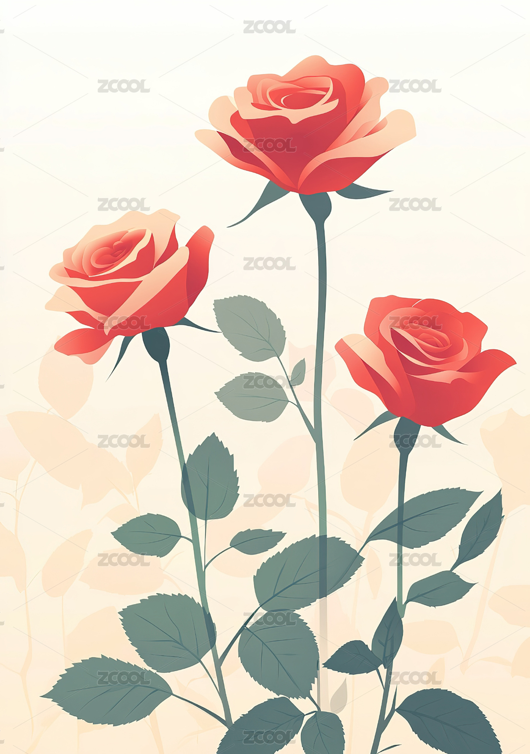 清新淡雅情人节玫瑰枝条与盛开的花朵