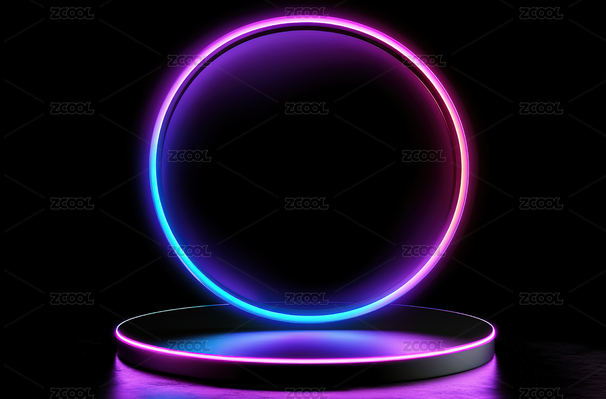 3D渲染霓虹灯带暗色圆形底座产品展台