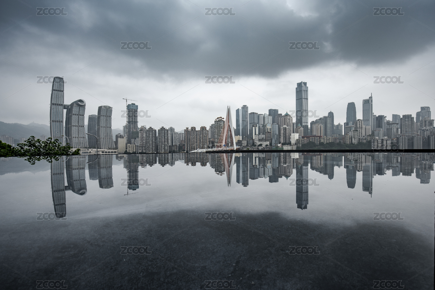 水池中倒映着的重庆城市风光