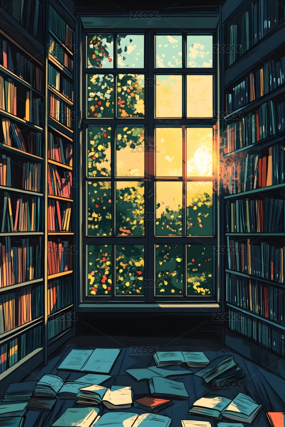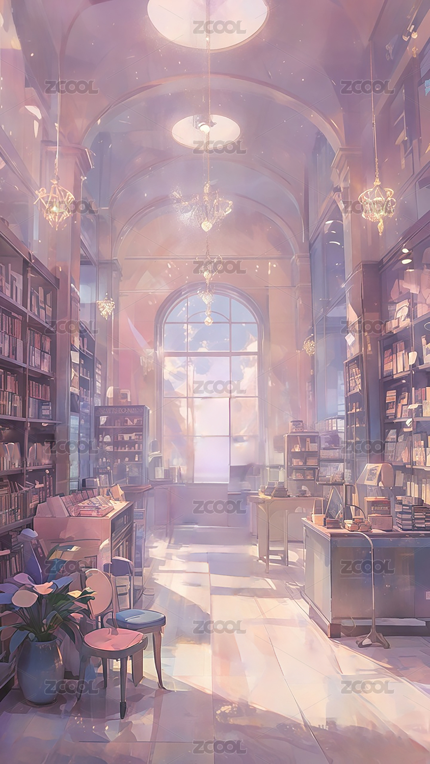 紫色浪漫印象派书店图书馆壁纸装饰画