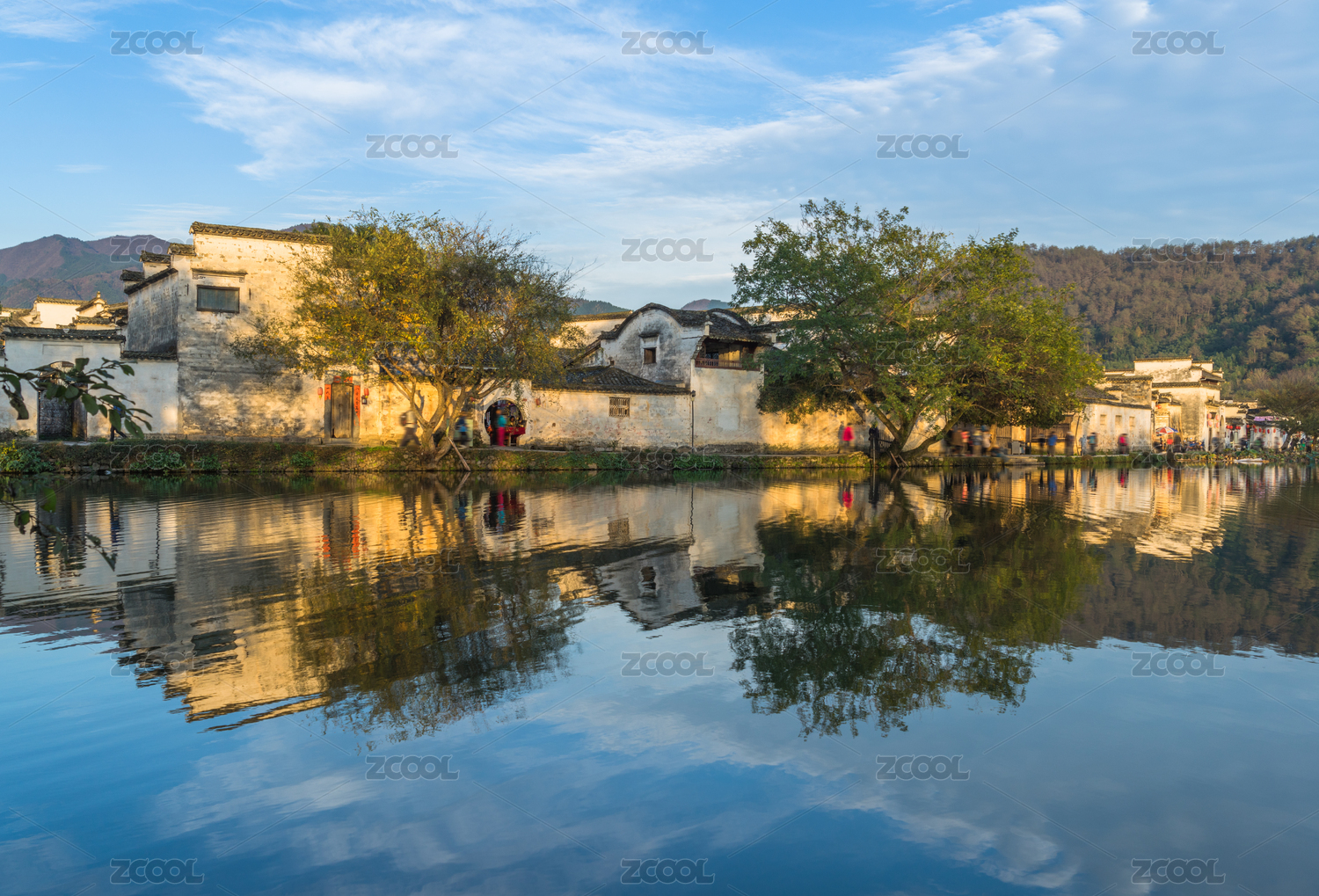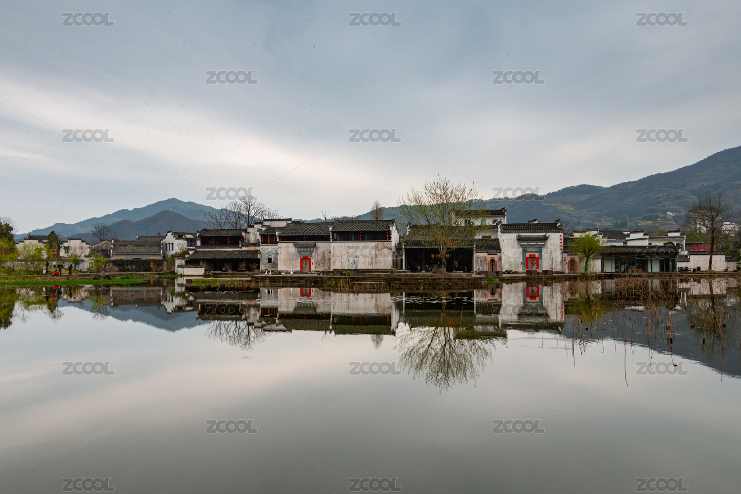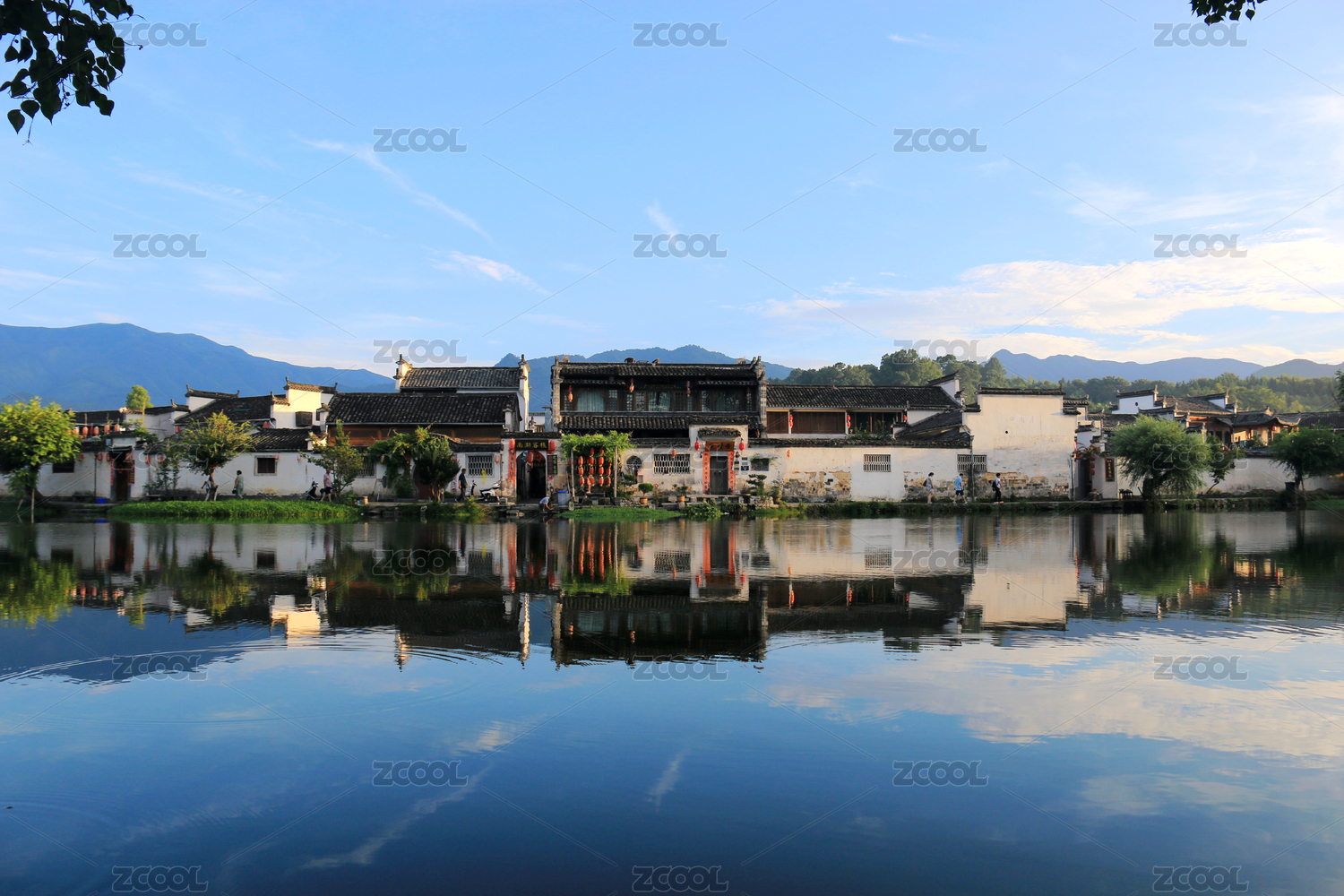 安徽宏村南湖湖边徽式建筑与倒影对称勾图拍