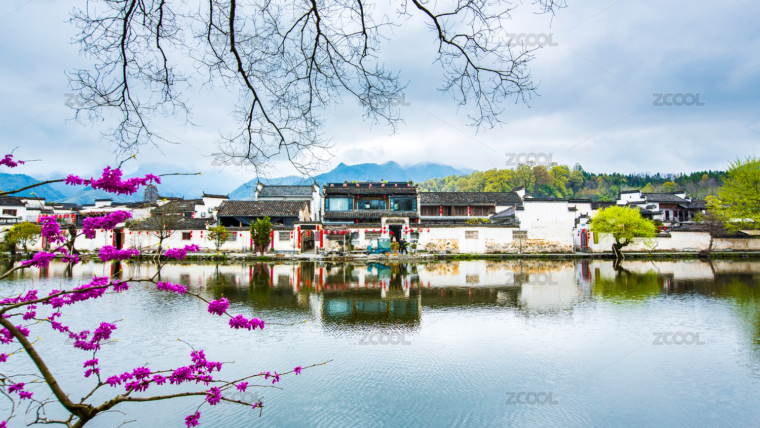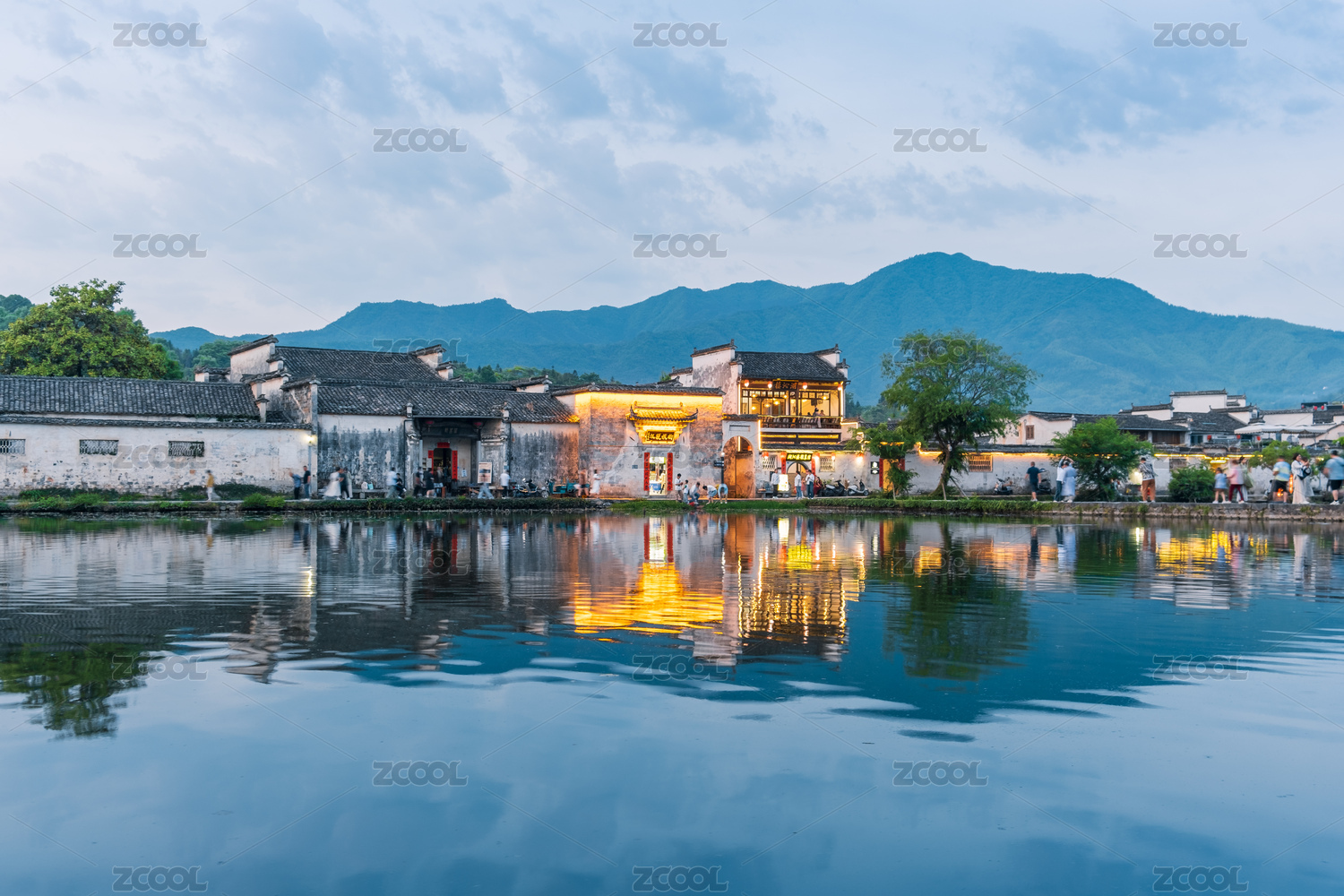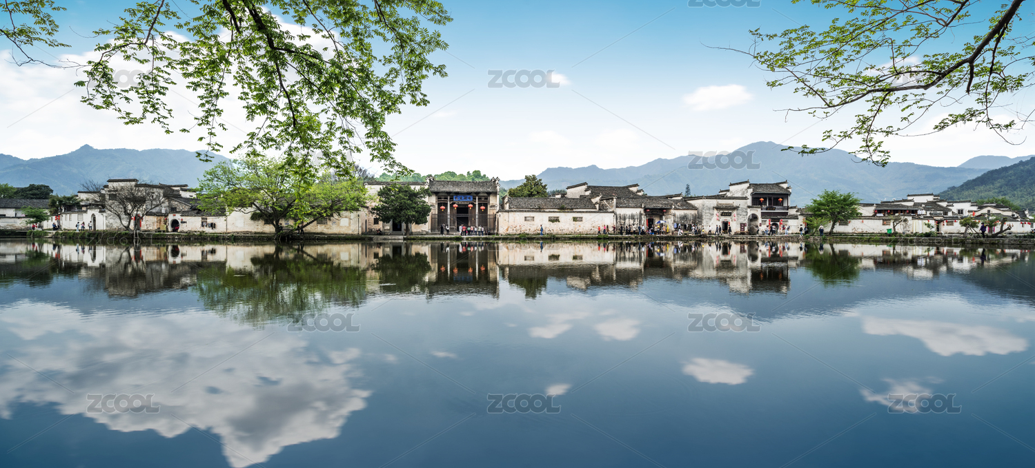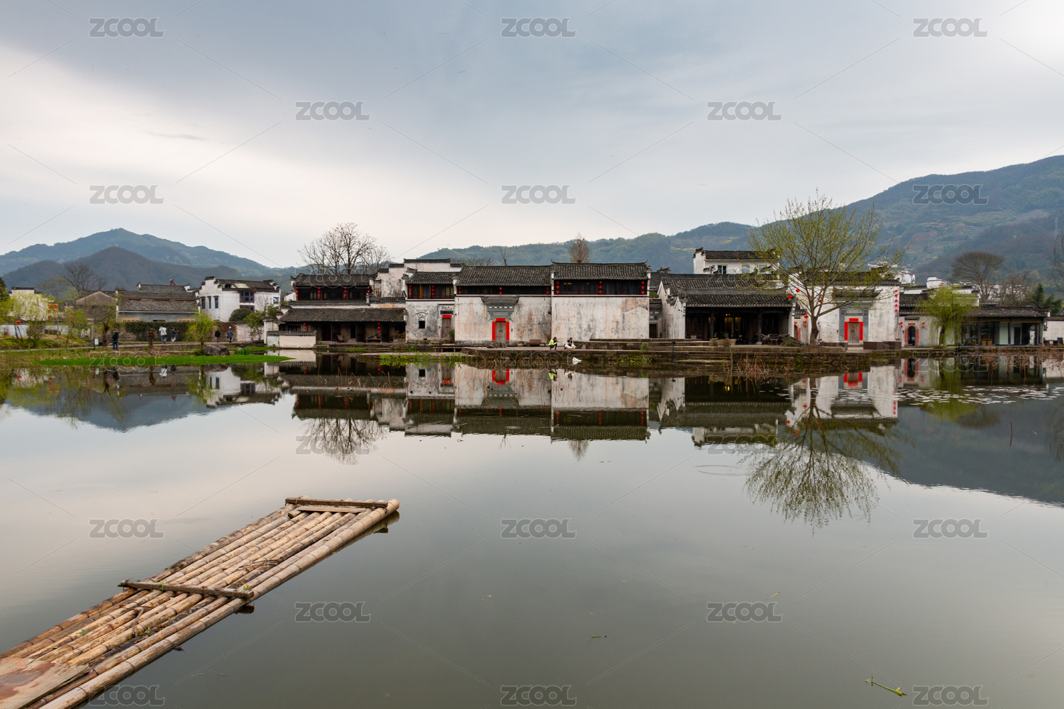 安徽宏村南湖湖边徽式建筑与倒影对称勾图拍