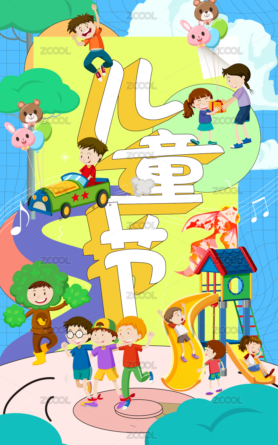 儿童节彩旗玩具文具气球脚踏车彩色卡通海报