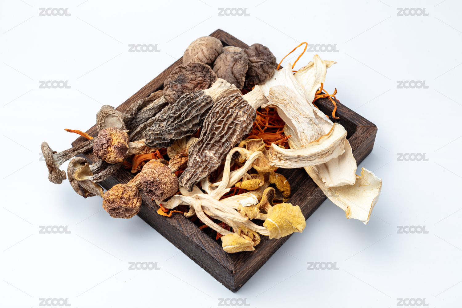 白色背景上摆放的晒干茶树菇