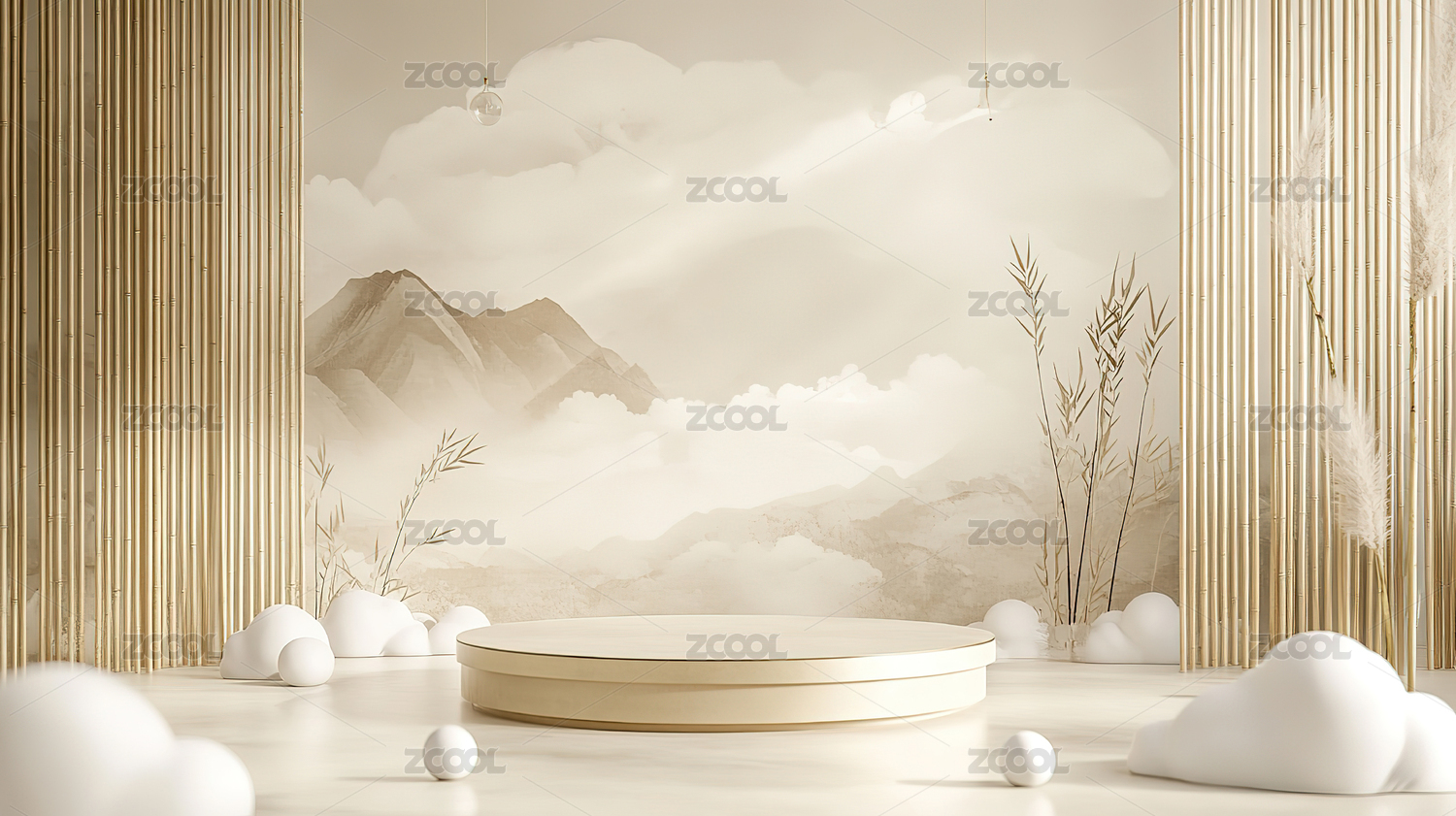 幻想色彩,圆形讲台,浅黄色,自然景观,广阔山脉,云朵,蜿蜒小路,小鸟,橙色调,中式背景