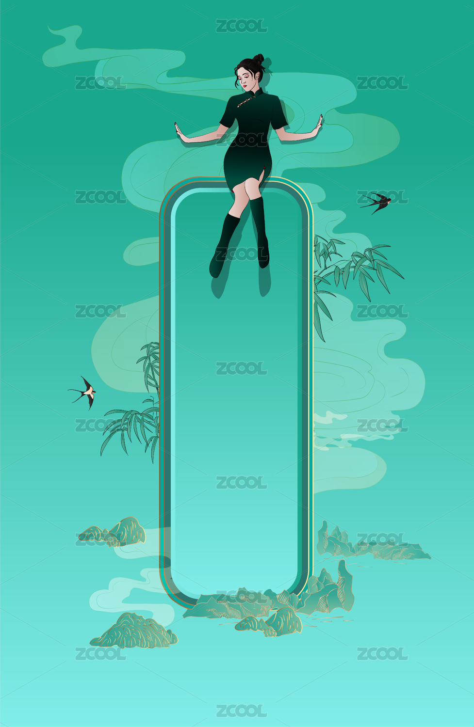 国潮古风祥云旗袍女孩中国画矢量海报模板