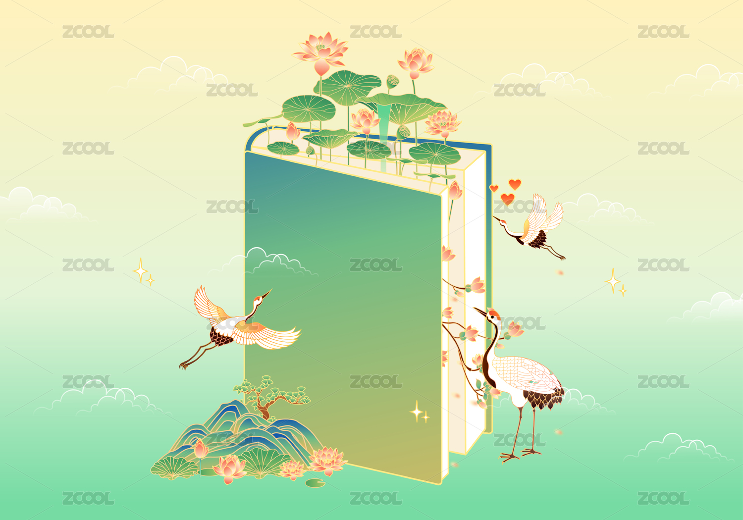 国潮祥云丹顶鹤工笔白描中国画矢量海报模板