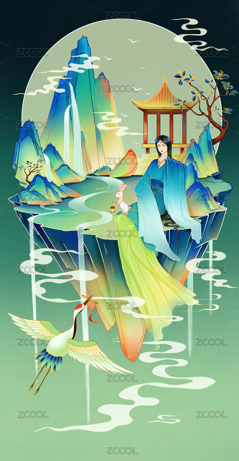 国潮中国风中秋节嫦娥青绿山水插画