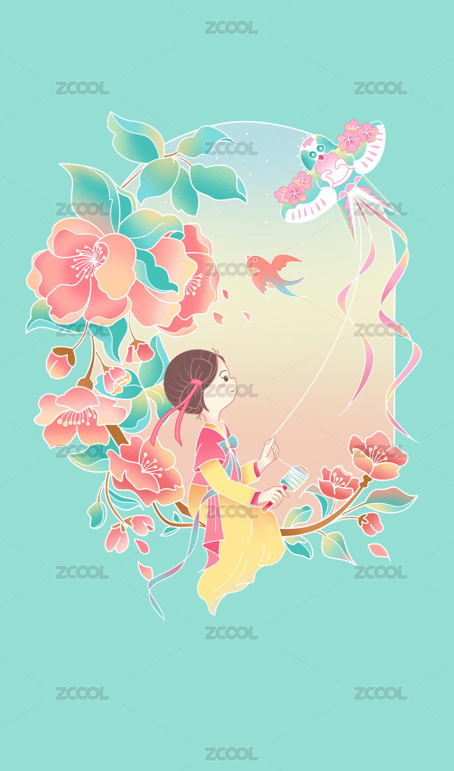 国风插画小女孩花朵