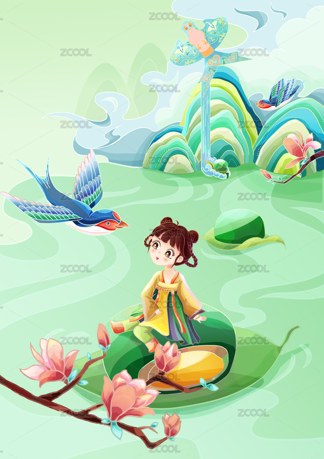 国潮中国风青绿女神山水插画