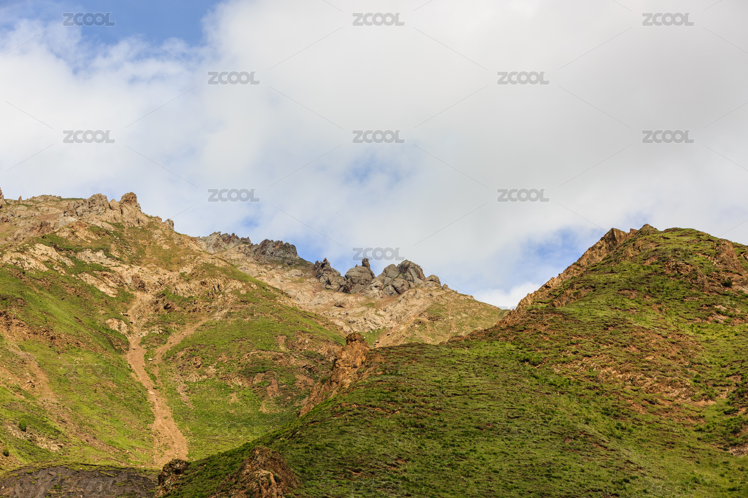 中国新疆夏季蓝天白云下G217独库公路沿途高山草原