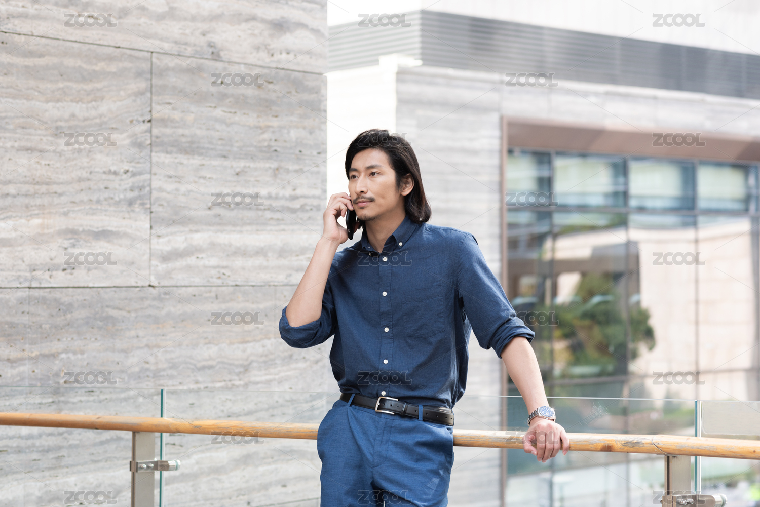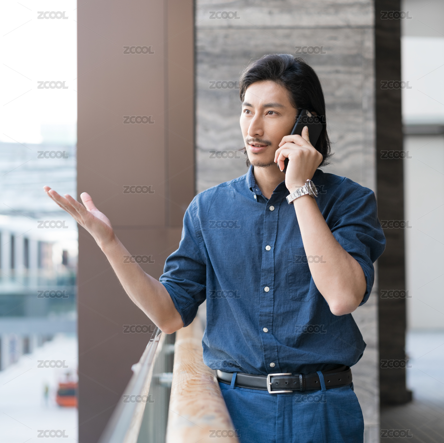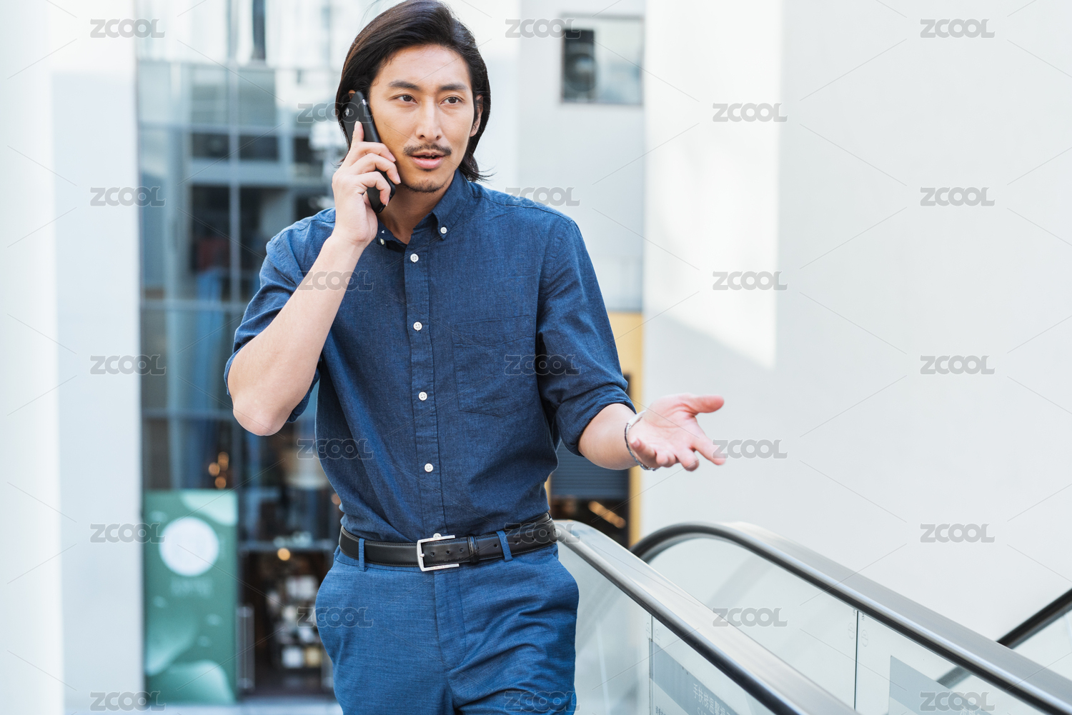 成熟自信的亚洲商务人士在自动扶梯上打电话