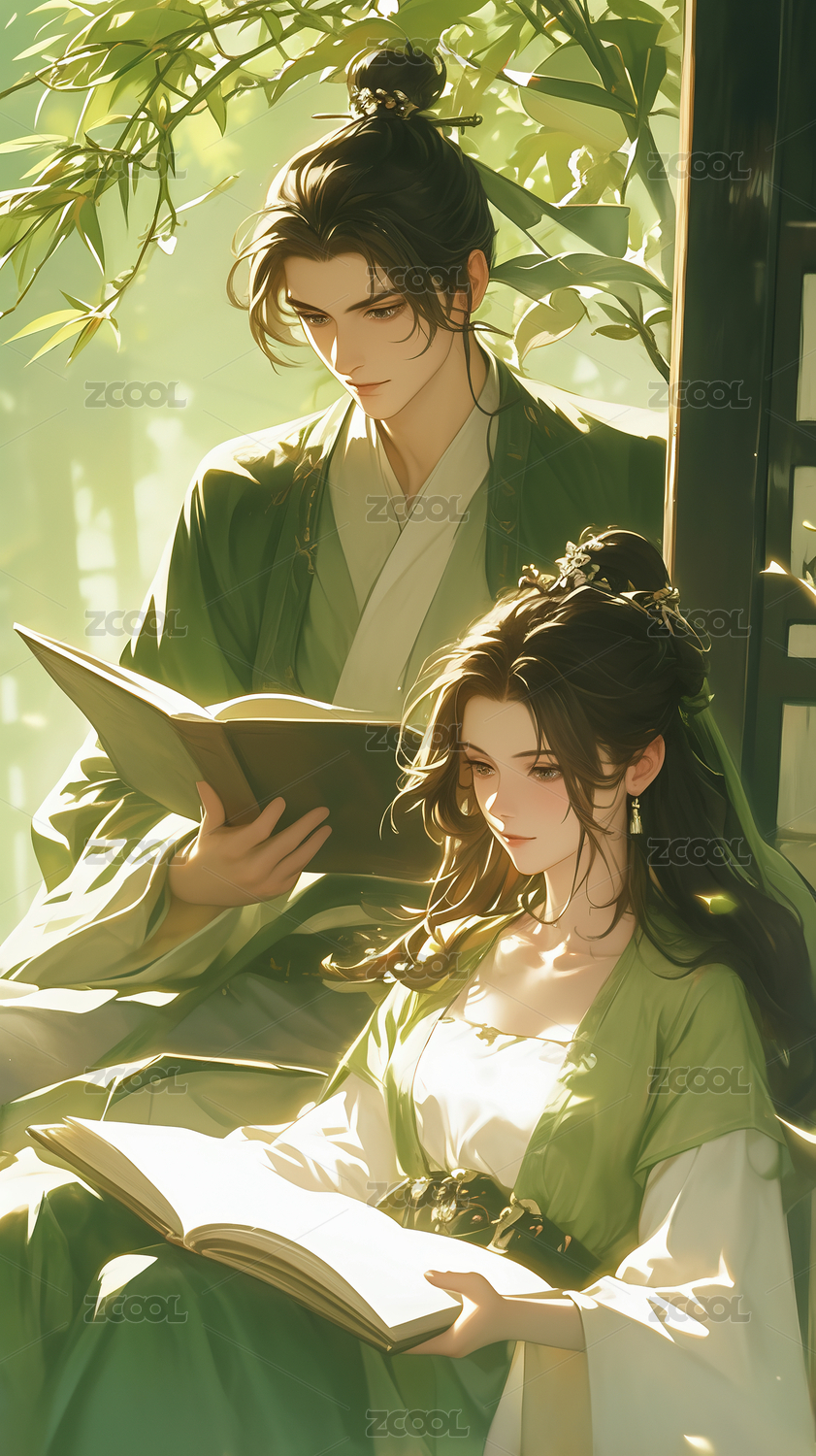 古风,情侣,插画,男人,女人,古代,自然,树叶,植物,悠闲