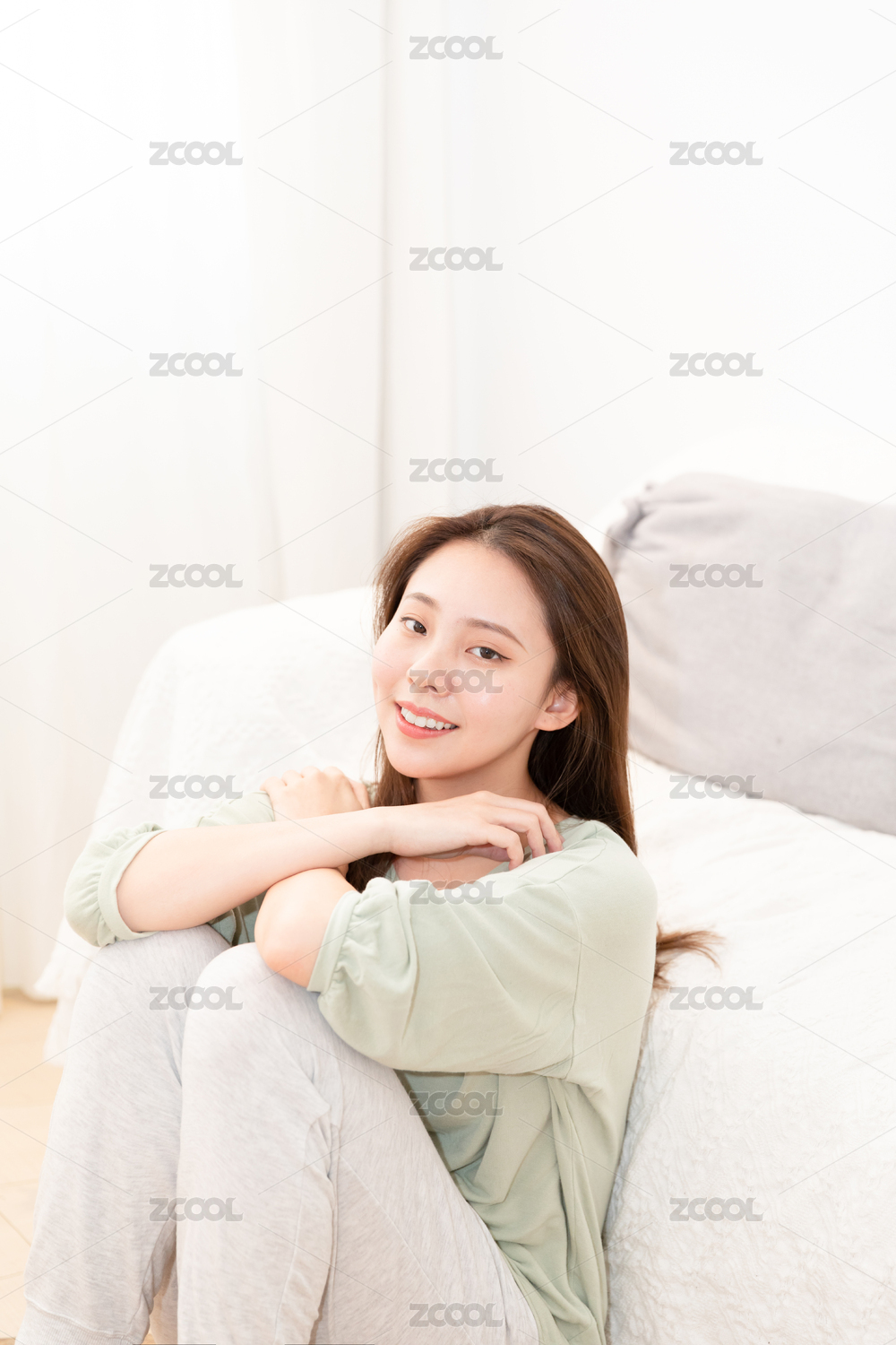 甜美女生穿着居家服靠着沙发坐着