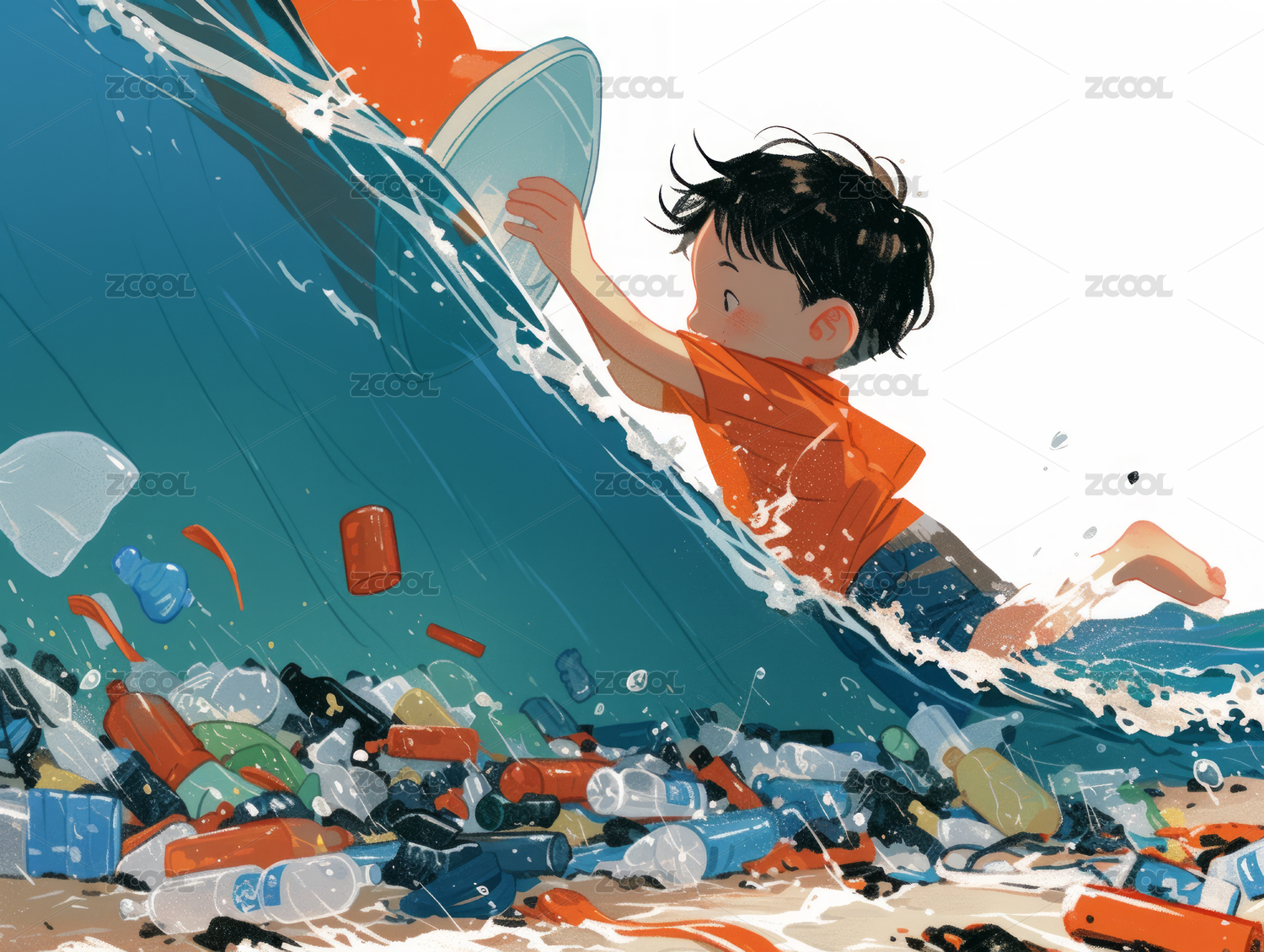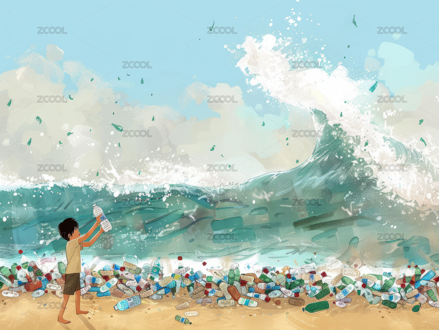 儿童,海滩,塑料瓶,浪潮,环境污染,海洋,警示,插画,影响,垃圾