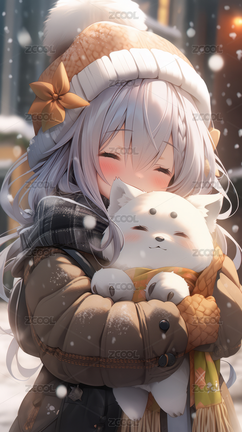 抱着可爱小动物穿冬装的可爱二次元女孩