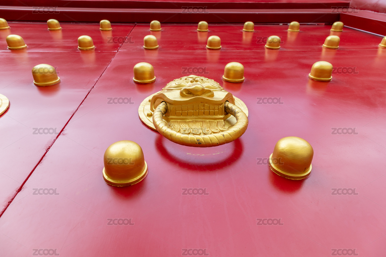 满是铜钉的红色大门特写