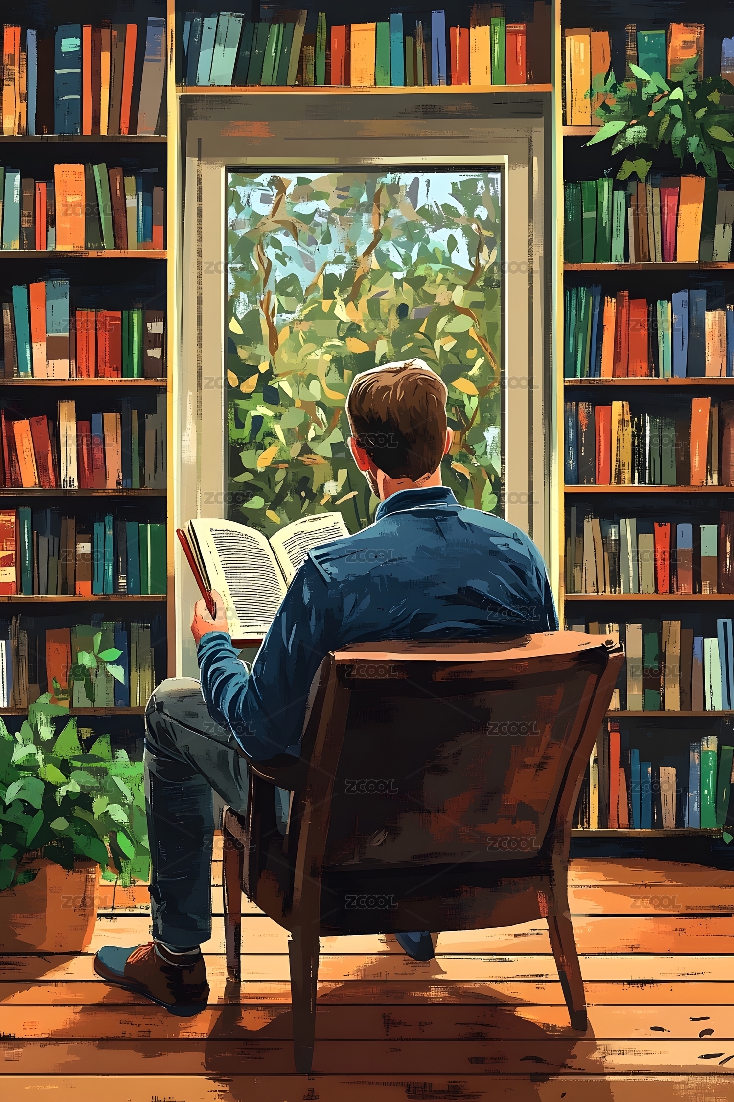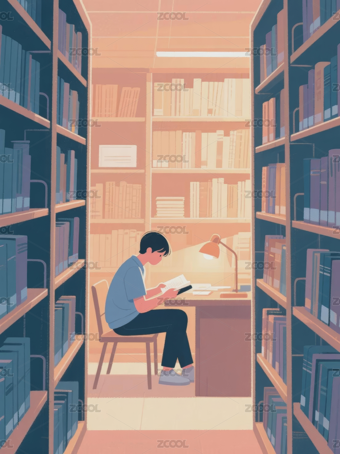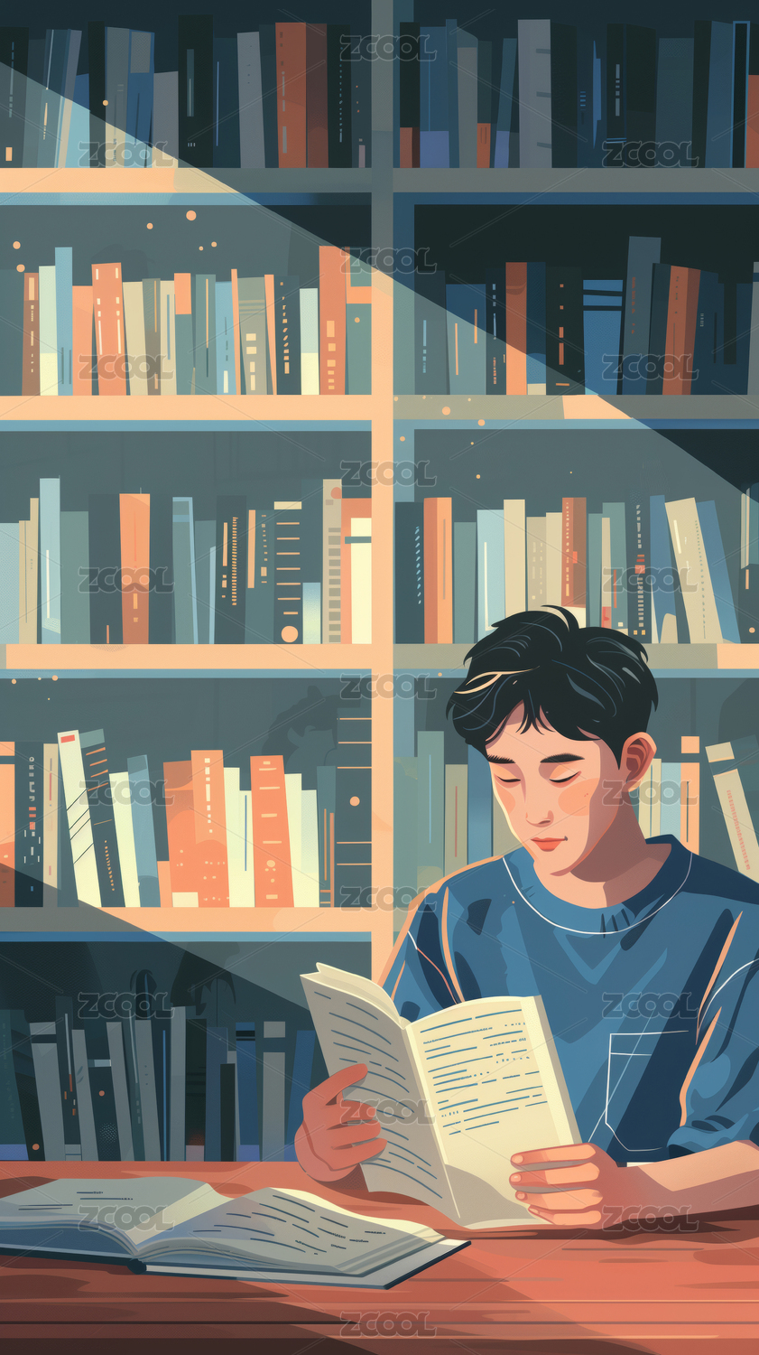 一个男生在图书馆看书的插画