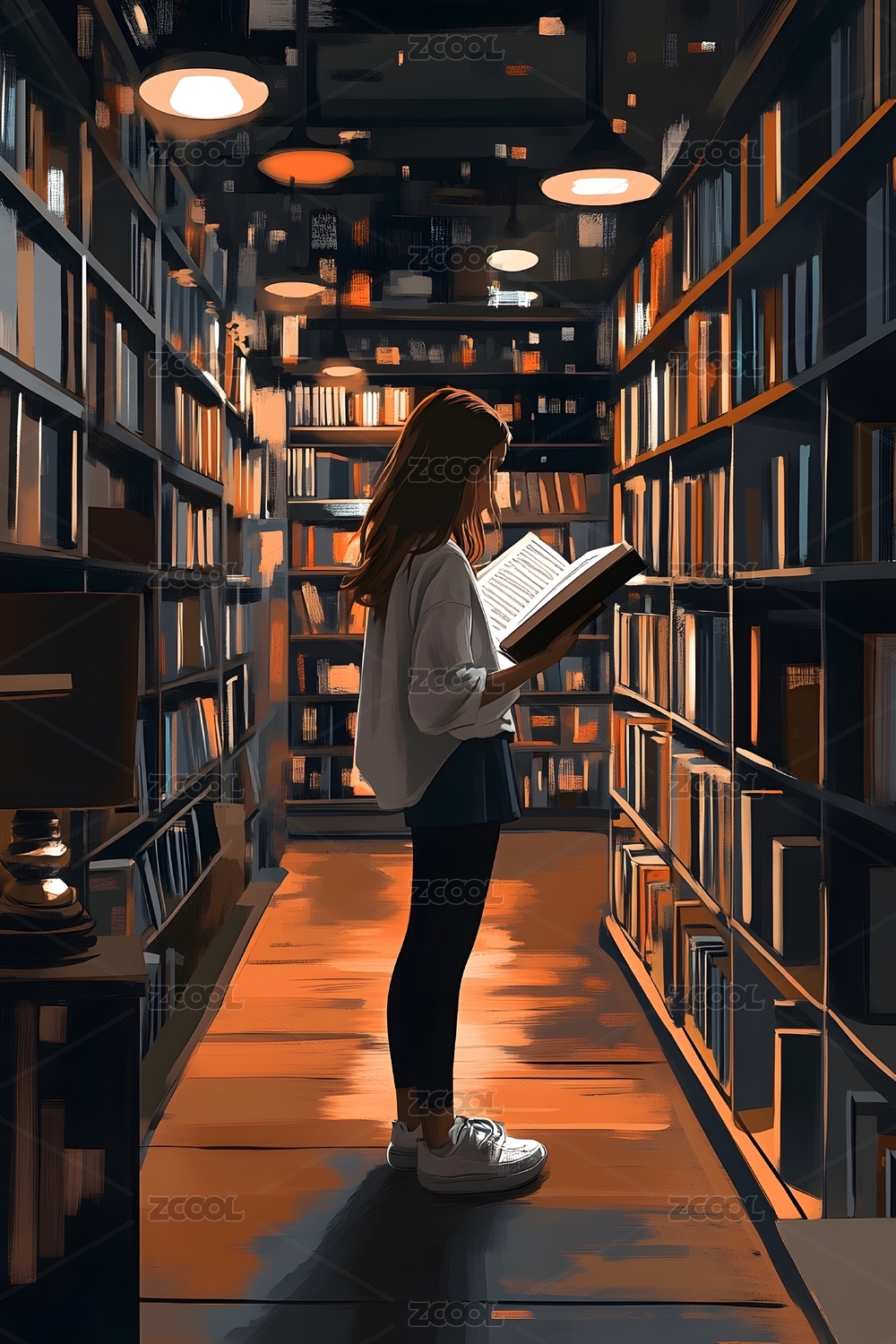 一个可爱的女生在图书馆看书的插画