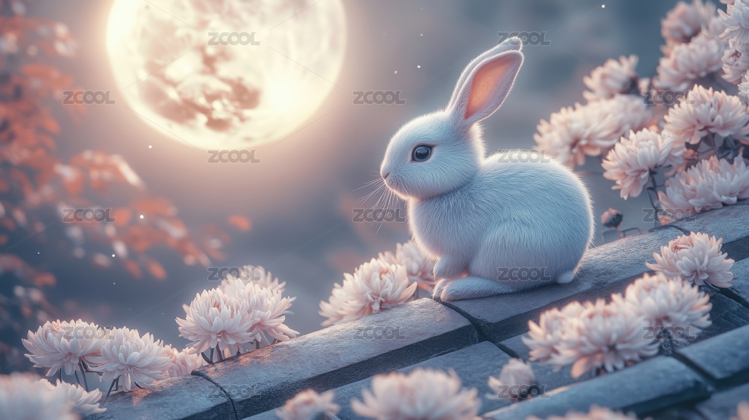 白兔满月花丛梦幻