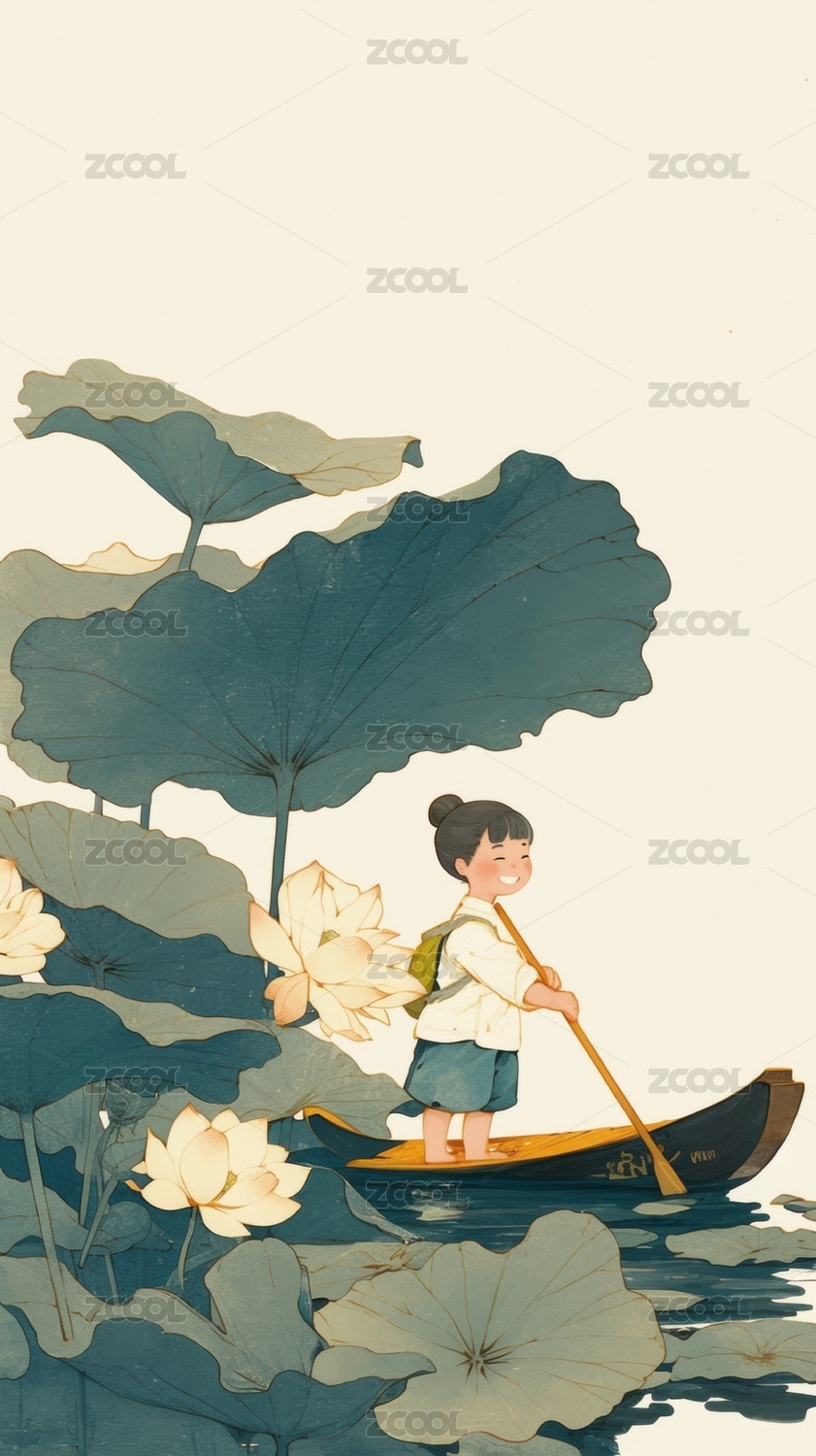 夏天立夏一个小孩在荷花池中划船唯美插画