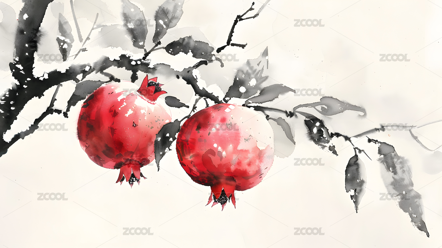 AIGCFG,中国风,水墨,插画,中式风格,水果,石榴