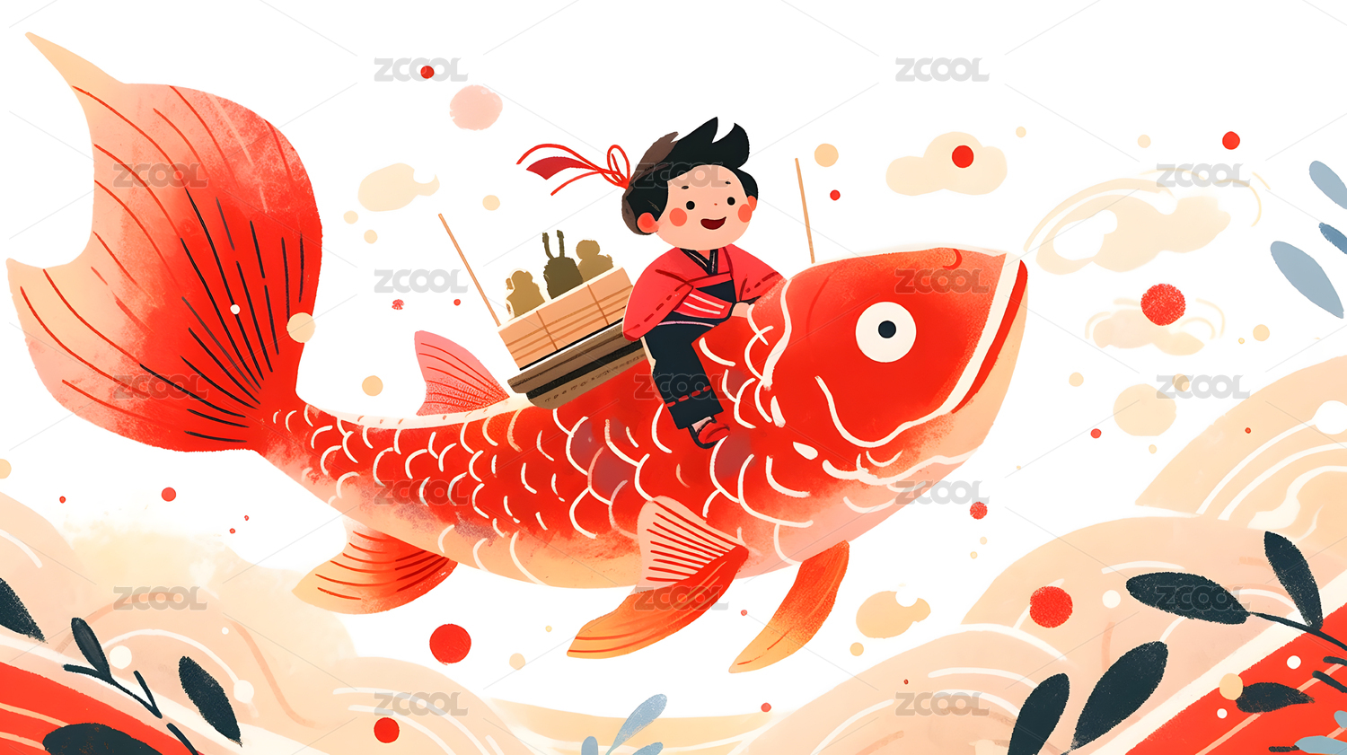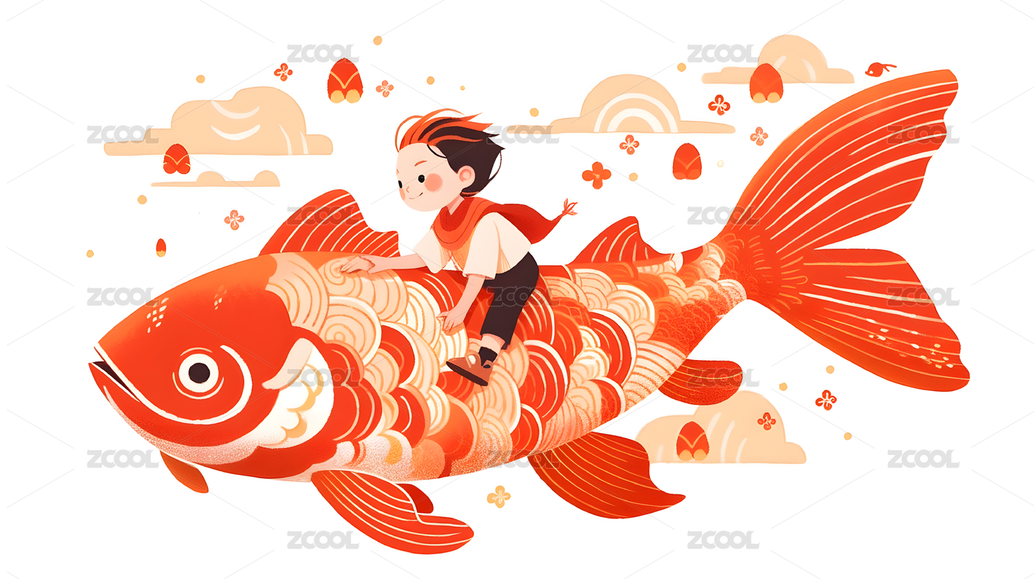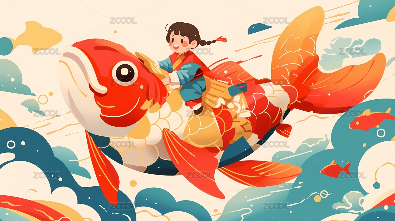 AIGCFG,中国风,插画,中式风格,国潮风,国风,锦鲤,鲤鱼,卡通,儿童