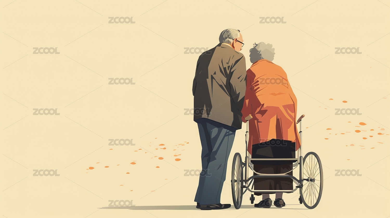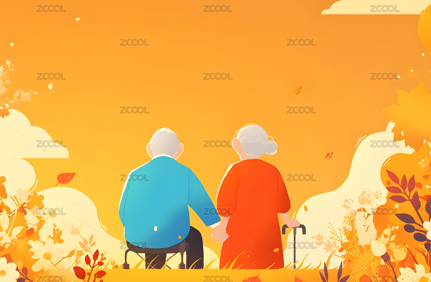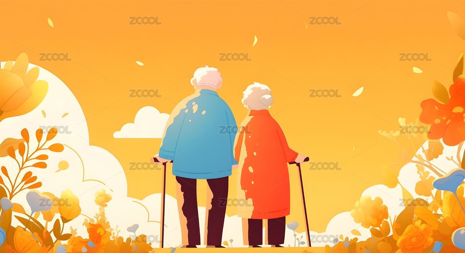 老年夫妻背影扁平风插画